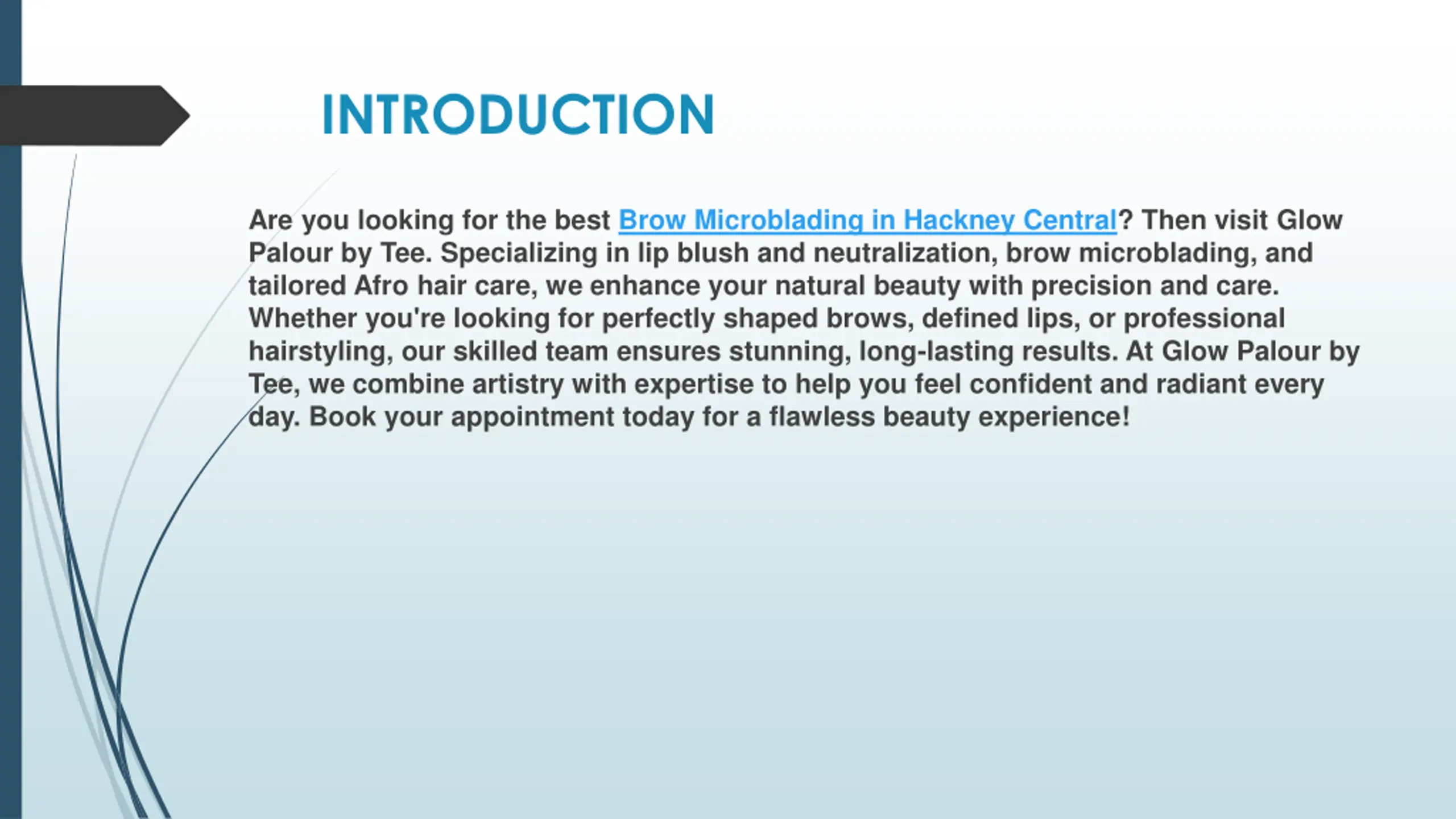 INTRODUCTION Are you looking for the best Brow Microblading in Hackney Central? Then visit Glow Palour by Tee. Specializing in lip blush and neutralization, brow microblading, and tailored Afro hair care, we enhance your natural beauty with precision and care. Whether you're looking for perfectly shaped brows, defined lips, or professional hairstyling, our skilled team ensures stunning, long-lasting results. At Glow Palour by Tee, we combine artistry with expertise to help you feel confident and radiant every day. Book your appointment today for a flawless beauty experience!