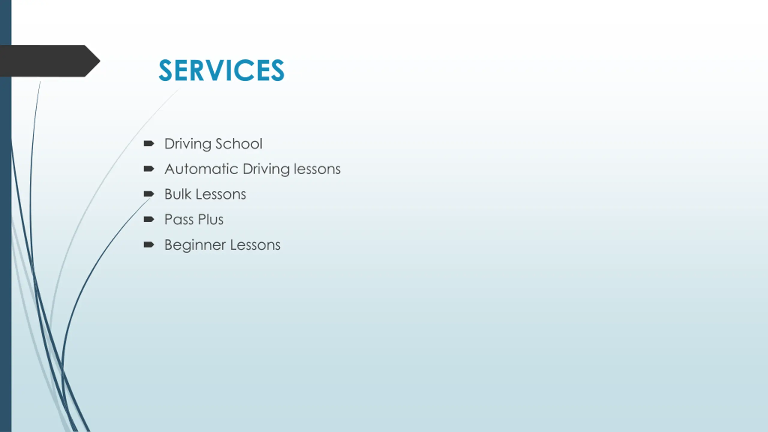 SERVICES Driving School Automatic Driving lessons Bulk Lessons Pass Plus Beginner Lessons