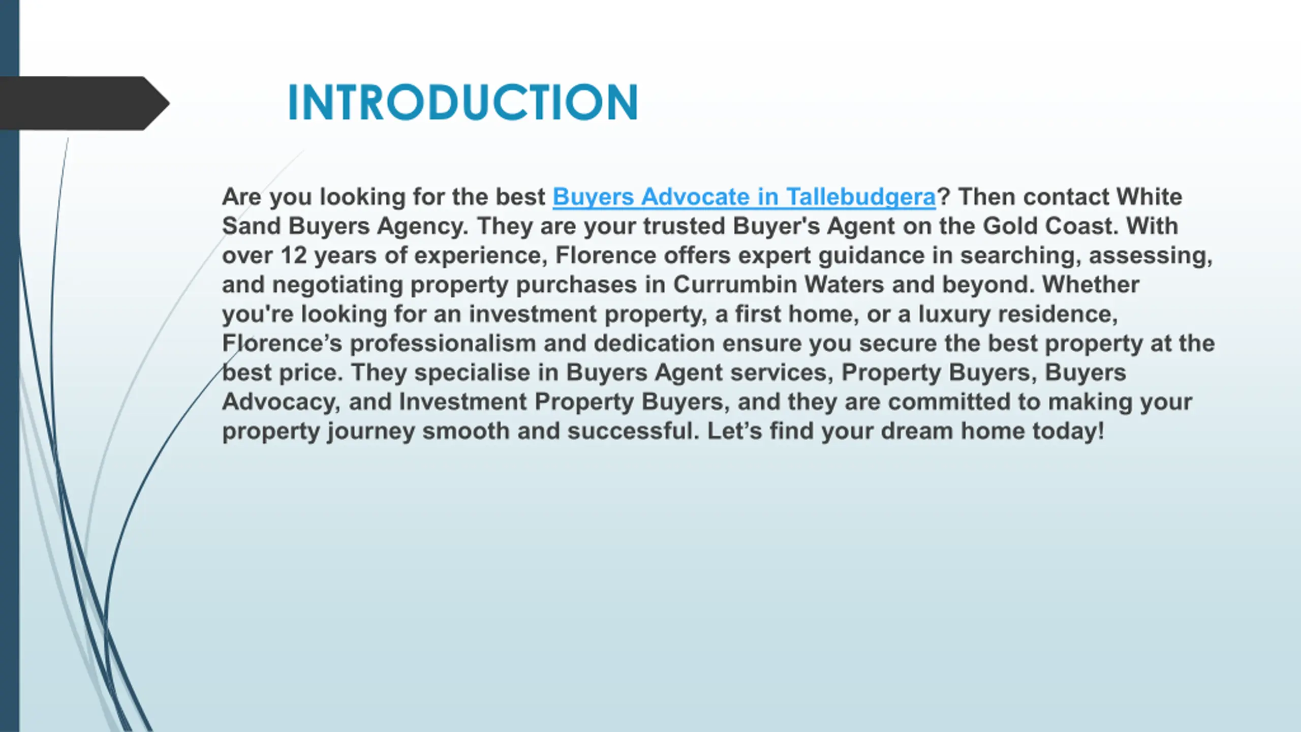 INTRODUCTION Are you looking for the best Buyers Advocate in Tallebudgera? Then contact White Sand Buyers Agency. They are your trusted Buyer's Agent on the Gold Coast. With over 12 years of experience, Florence offers expert guidance in searching, assessing, and negotiating property purchases in Currumbin Waters and beyond. Whether you're looking for an investment property, a first home, or a luxury residence, Florence s professionalism and dedication ensure you secure the best property at the best price. They specialise in Buyers Agent services, Property Buyers, Buyers Advocacy, and Investment Property Buyers, and they are committed to making your property journey smooth and successful. Let s find your dream home today!