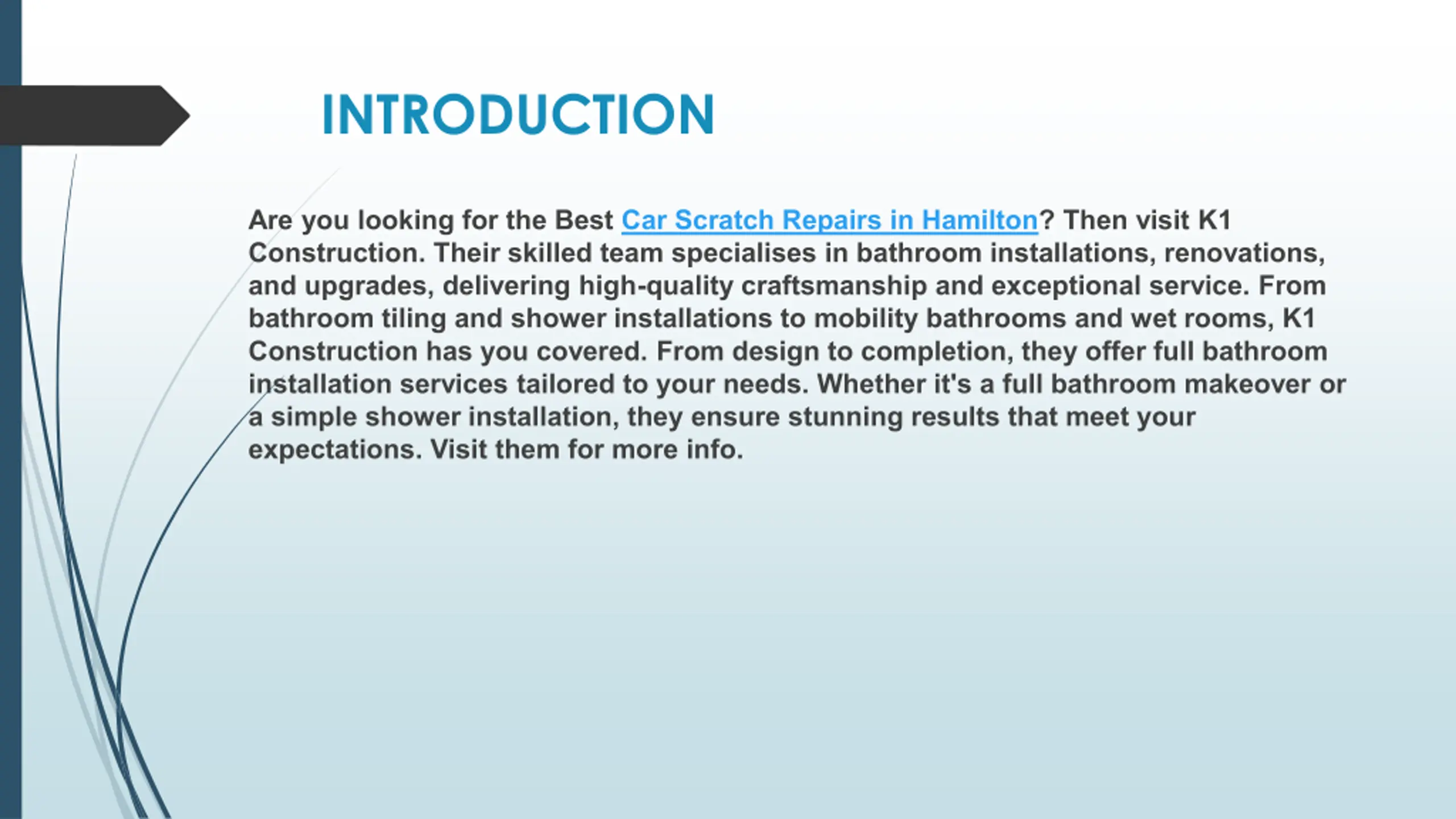 INTRODUCTION Are you looking for the Best Car Scratch Repairs in Hamilton? Then visit K1 Construction. Their skilled team specialises in bathroom installations, renovations, and upgrades, delivering high-quality craftsmanship and exceptional service. From bathroom tiling and shower installations to mobility bathrooms and wet rooms, K1 Construction has you covered. From design to completion, they offer full bathroom installation services tailored to your needs. Whether it's a full bathroom makeover or a simple shower installation, they ensure stunning results that meet your expectations. Visit them for more info.