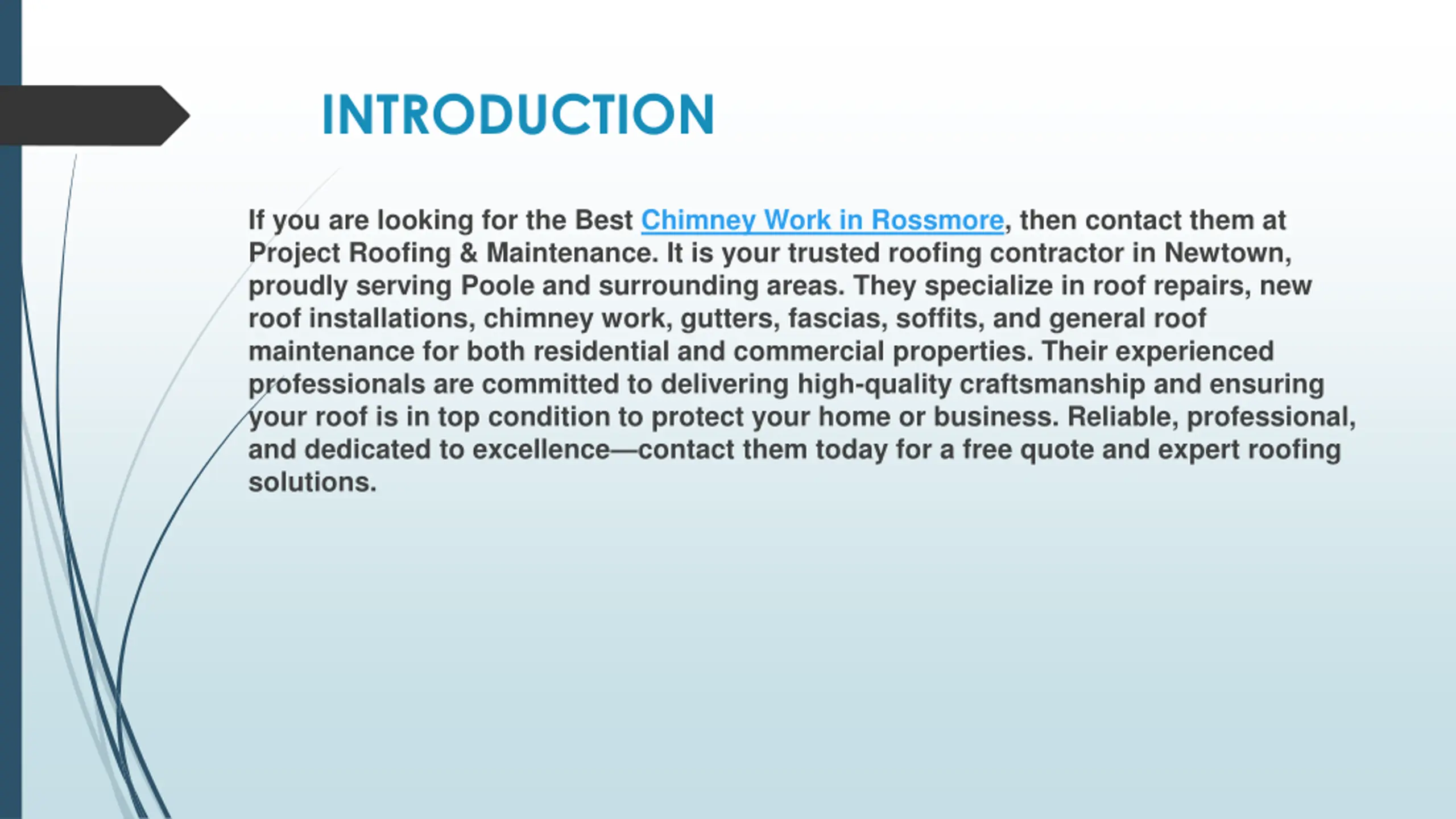 INTRODUCTION If you are looking for the Best Chimney Work in Rossmore, then contact them at Project Roofing & Maintenance. It is your trusted roofing contractor in Newtown, proudly serving Poole and surrounding areas. They specialize in roof repairs, new roof installations, chimney work, gutters, fascias, soffits, and general roof maintenance for both residential and commercial properties. Their experienced professionals are committed to delivering high-quality craftsmanship and ensuring your roof is in top condition to protect your home or business. Reliable, professional, and dedicated to excellence contact them today for a free quote and expert roofing solutions.