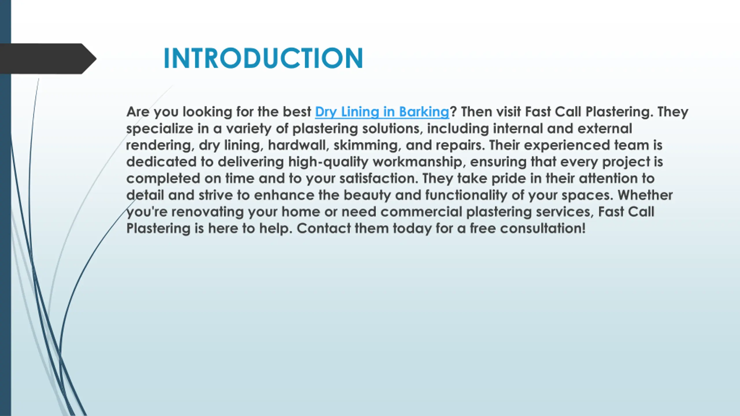 INTRODUCTION Are you looking for the best Dry Lining in Barking? Then visit Fast Call Plastering. They specialize in a variety of plastering solutions, including internal and external rendering, dry lining, hardwall, skimming, and repairs. Their experienced team is dedicated to delivering high-quality workmanship, ensuring that every project is completed on time and to your satisfaction. They take pride in their attention to detail and strive to enhance the beauty and functionality of your spaces. Whether you're renovating your home or need commercial plastering services, Fast Call Plastering is here to help. Contact them today for a free consultation!