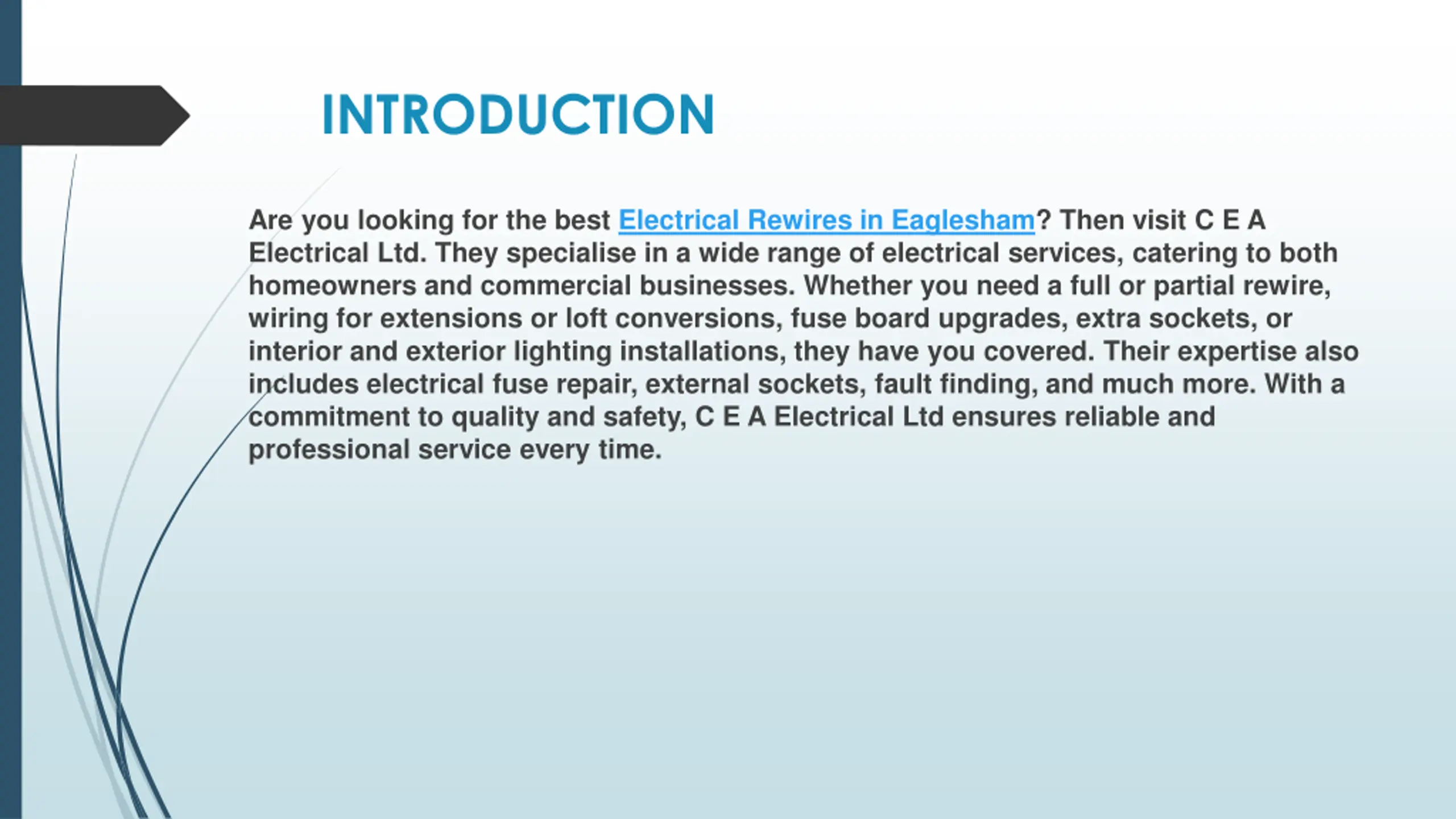 INTRODUCTION Are you looking for the best Electrical Rewires in Eaglesham? Then visit C E A Electrical Ltd. They specialise in a wide range of electrical services, catering to both homeowners and commercial businesses. Whether you need a full or partial rewire, wiring for extensions or loft conversions, fuse board upgrades, extra sockets, or interior and exterior lighting installations, they have you covered. Their expertise also includes electrical fuse repair, external sockets, fault finding, and much more. With a commitment to quality and safety, C E A Electrical Ltd ensures reliable and professional service every time.