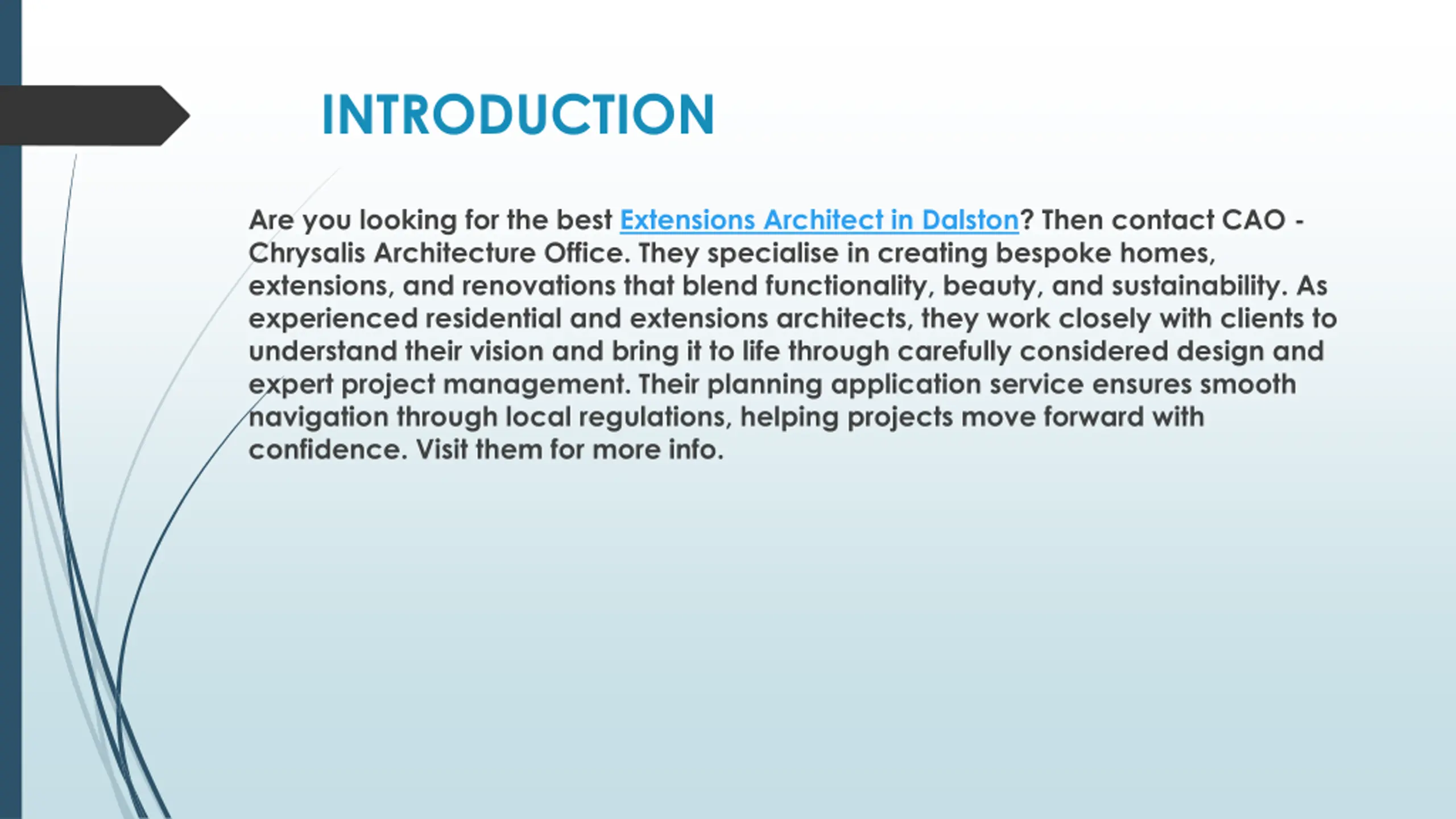 INTRODUCTION Are you looking for the best Extensions Architect in Dalston? Then contact CAO - Chrysalis Architecture Office. They specialise in creating bespoke homes, extensions, and renovations that blend functionality, beauty, and sustainability. As experienced residential and extensions architects, they work closely with clients to understand their vision and bring it to life through carefully considered design and expert project management. Their planning application service ensures smooth navigation through local regulations, helping projects move forward with confidence. Visit them for more info.
