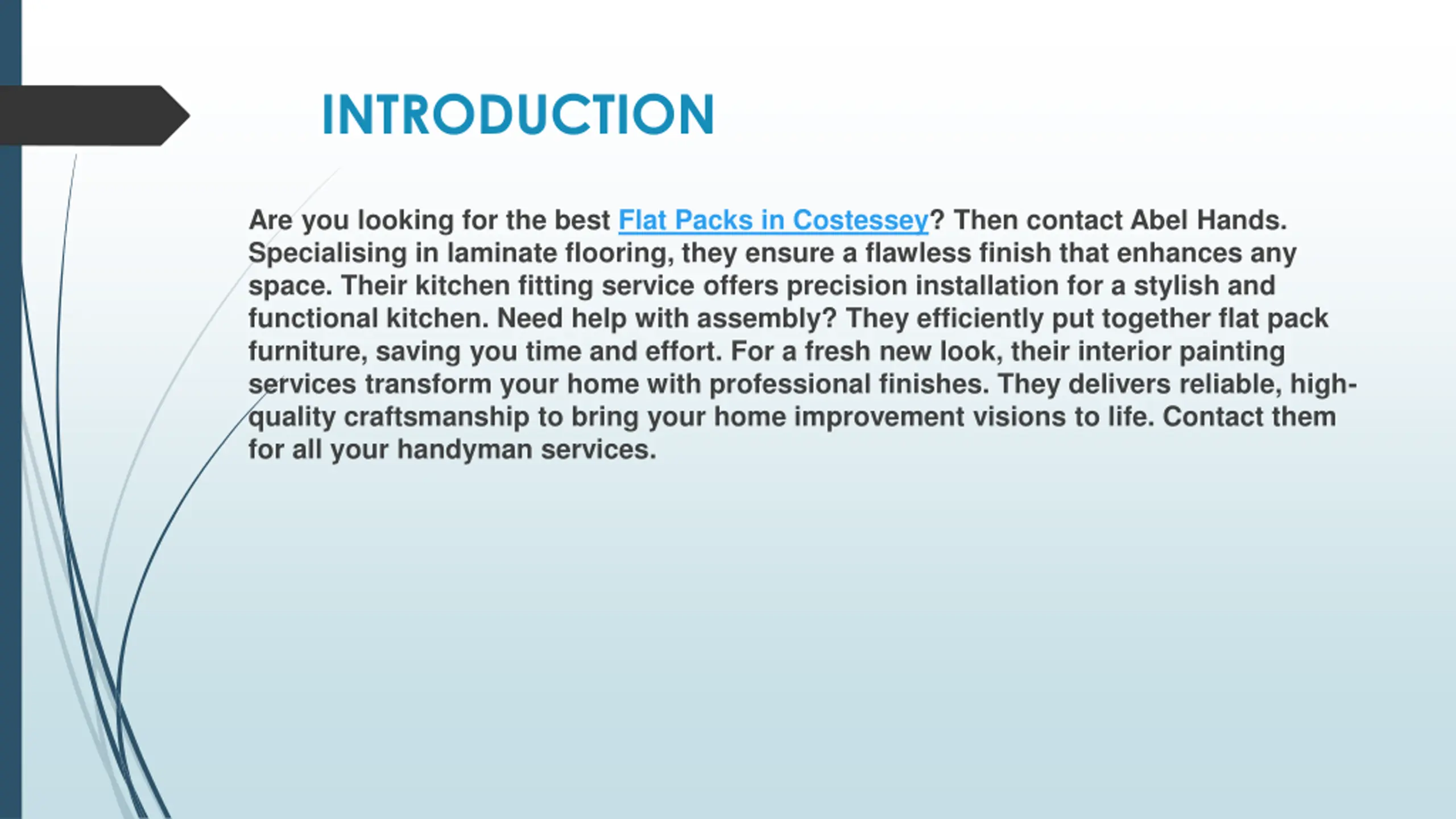 INTRODUCTION Are you looking for the best Flat Packs in Costessey? Then contact Abel Hands. Specialising in laminate flooring, they ensure a flawless finish that enhances any space. Their kitchen fitting service offers precision installation for a stylish and functional kitchen. Need help with assembly? They efficiently put together flat pack furniture, saving you time and effort. For a fresh new look, their interior painting services transform your home with professional finishes. They delivers reliable, high- quality craftsmanship to bring your home improvement visions to life. Contact them for all your handyman services.