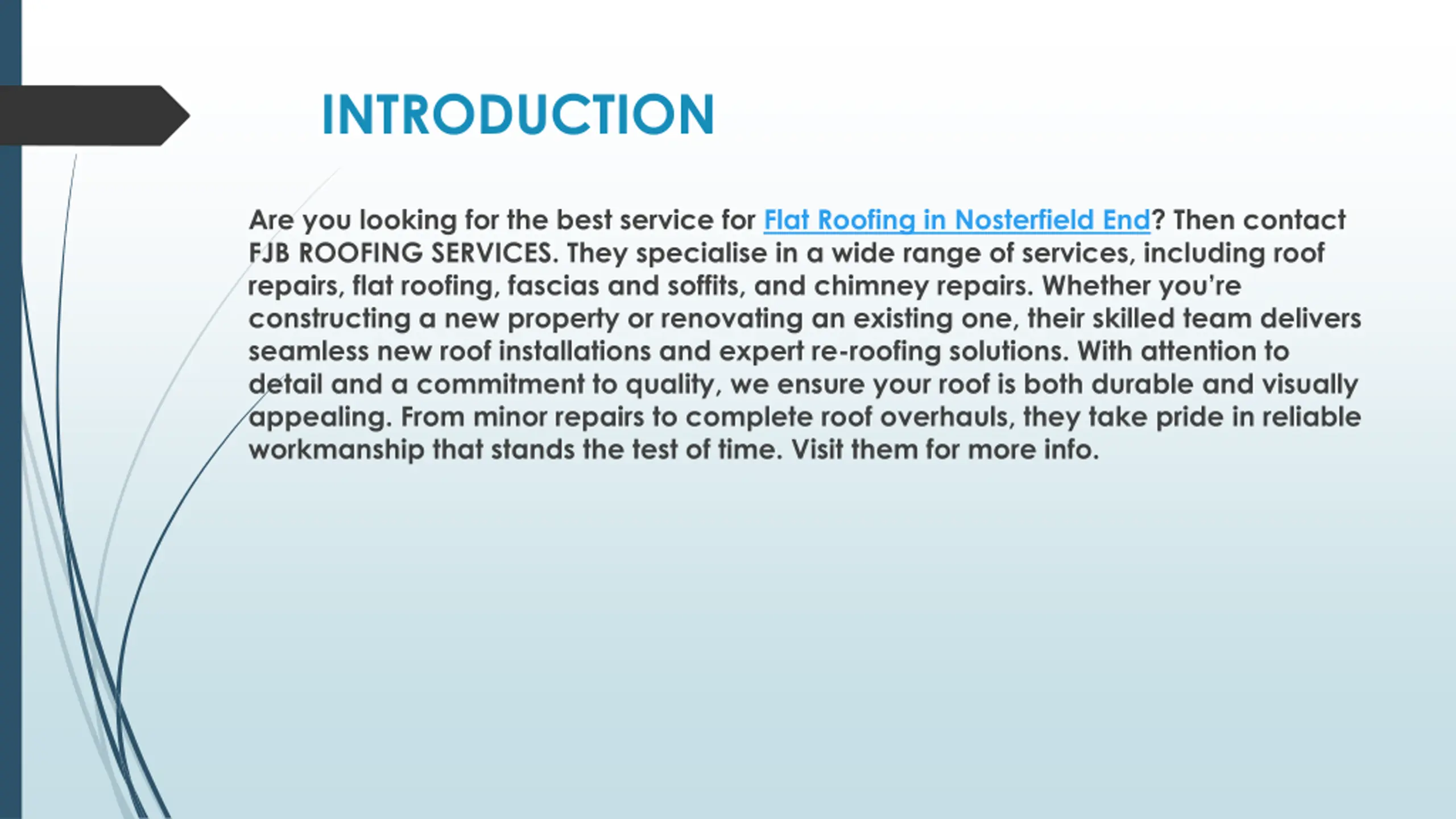 INTRODUCTION Are you looking for the best service for Flat Roofing in Nosterfield End? Then contact FJB ROOFING SERVICES. They specialise in a wide range of services, including roof repairs, flat roofing, fascias and soffits, and chimney repairs. Whether you re constructing a new property or renovating an existing one, their skilled team delivers seamless new roof installations and expert re-roofing solutions. With attention to detail and a commitment to quality, we ensure your roof is both durable and visually appealing. From minor repairs to complete roof overhauls, they take pride in reliable workmanship that stands the test of time. Visit them for more info.