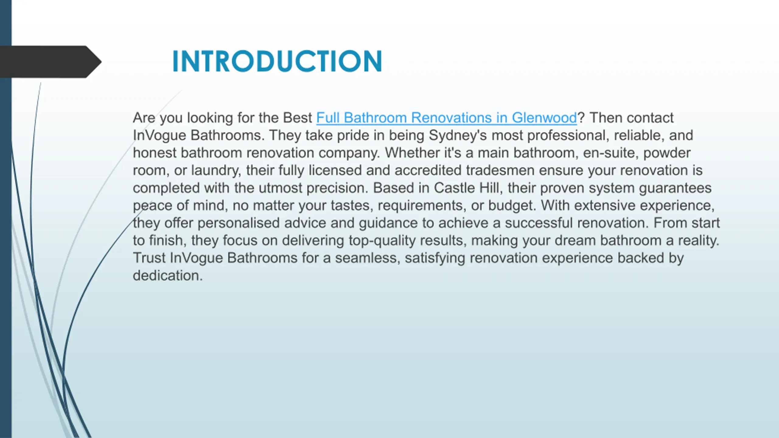 INTRODUCTION Are you looking for the Best Full Bathroom Renovations in Glenwood? Then contact InVogue Bathrooms. They take pride in being Sydney's most professional, reliable, and honest bathroom renovation company. Whether it's a main bathroom, en-suite, powder room, or laundry, their fully licensed and accredited tradesmen ensure your renovation is completed with the utmost precision. Based in Castle Hill, their proven system guarantees peace of mind, no matter your tastes, requirements, or budget. With extensive experience, they offer personalised advice and guidance to achieve a successful renovation. From start to finish, they focus on delivering top-quality results, making your dream bathroom a reality. Trust InVogue Bathrooms for a seamless, satisfying renovation experience backed by dedication.