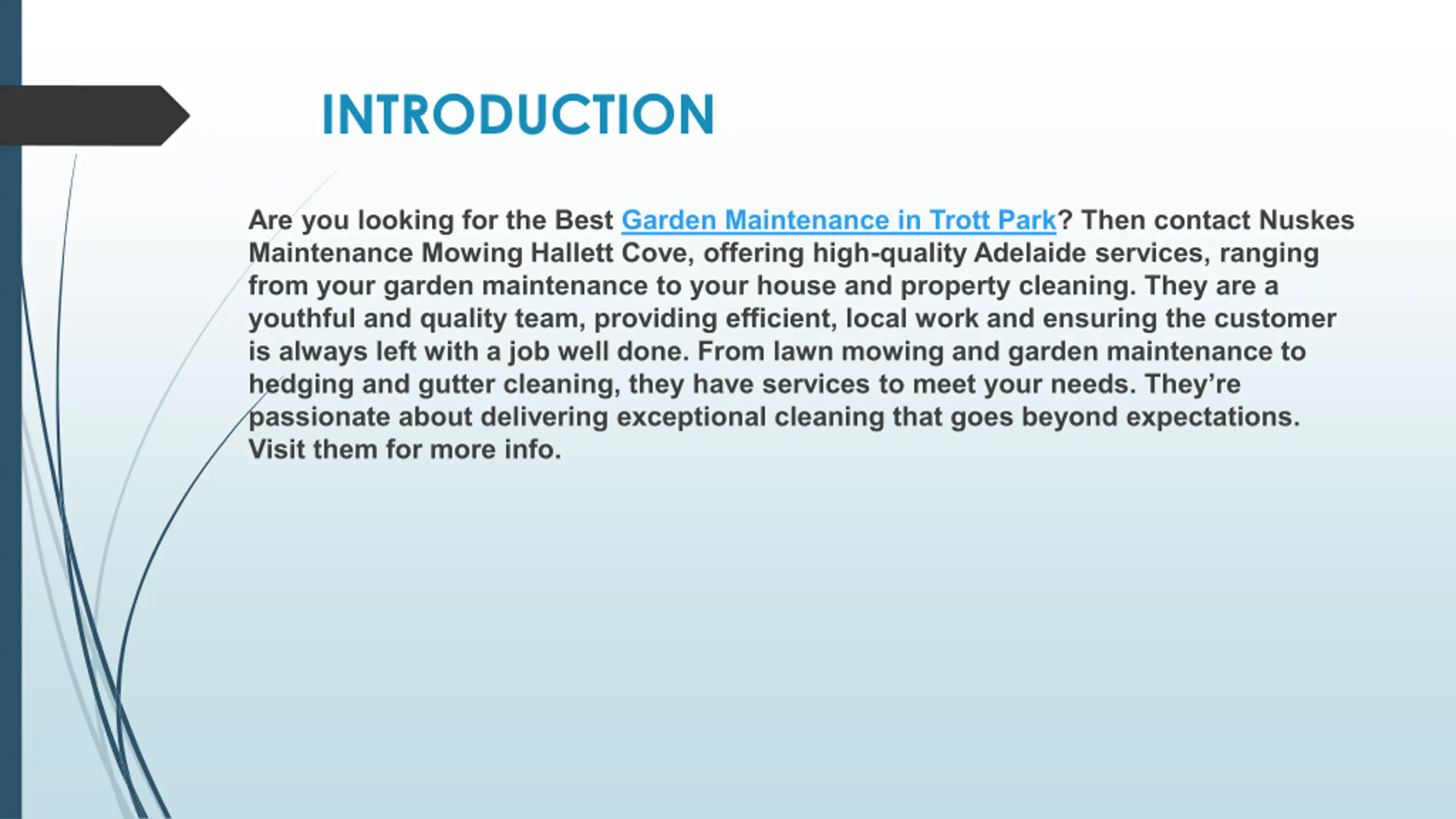 INTRODUCTION Are you looking for the Best Garden Maintenance in Trott Park? Then contact Nuskes Maintenance Mowing Hallett Cove, offering high-quality Adelaide services, ranging from your garden maintenance to your house and property cleaning. They are a youthful and quality team, providing efficient, local work and ensuring the customer is always left with a job well done. From lawn mowing and garden maintenance to hedging and gutter cleaning, they have services to meet your needs. They re passionate about delivering exceptional cleaning that goes beyond expectations. Visit them for more info.