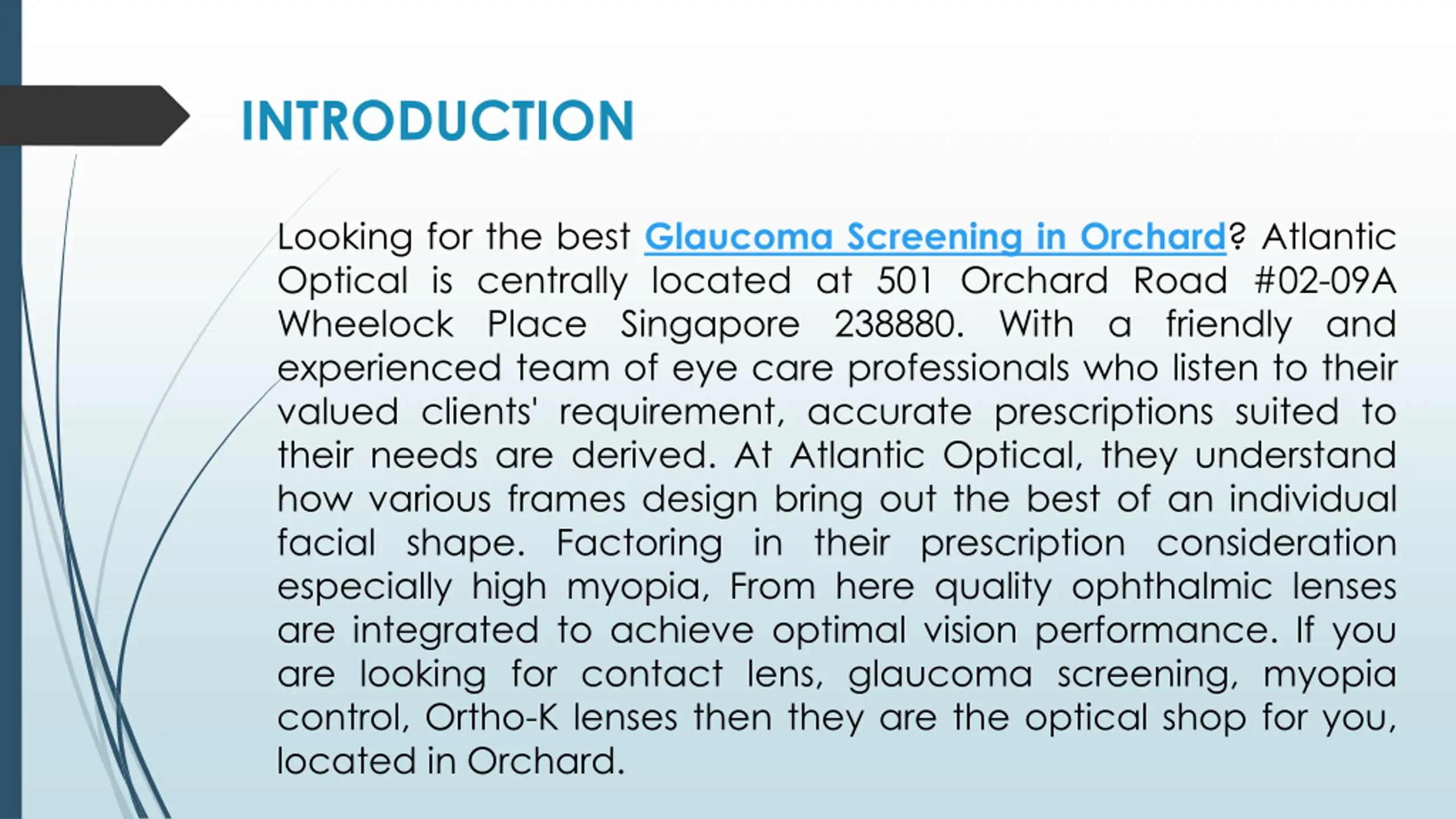 INTRODUCTION Looking for the best Glaucoma Screening in Orchard? Atlantic Optical is centrally located at 501 Orchard Road #02-09A Wheelock Place Singapore 238880. With a friendly and experienced team of eye care professionals who listen to their valued clients' requirement, accurate prescriptions suited to their needs are derived. At Atlantic Optical, they understand how various frames design bring out the best of an individual facial shape. Factoring in their prescription consideration especially high myopia, From here quality ophthalmic lenses are integrated to achieve optimal vision performance. If you are looking for contact lens, glaucoma screening, myopia control, Ortho-K lenses then they are the optical shop for you, located in Orchard.