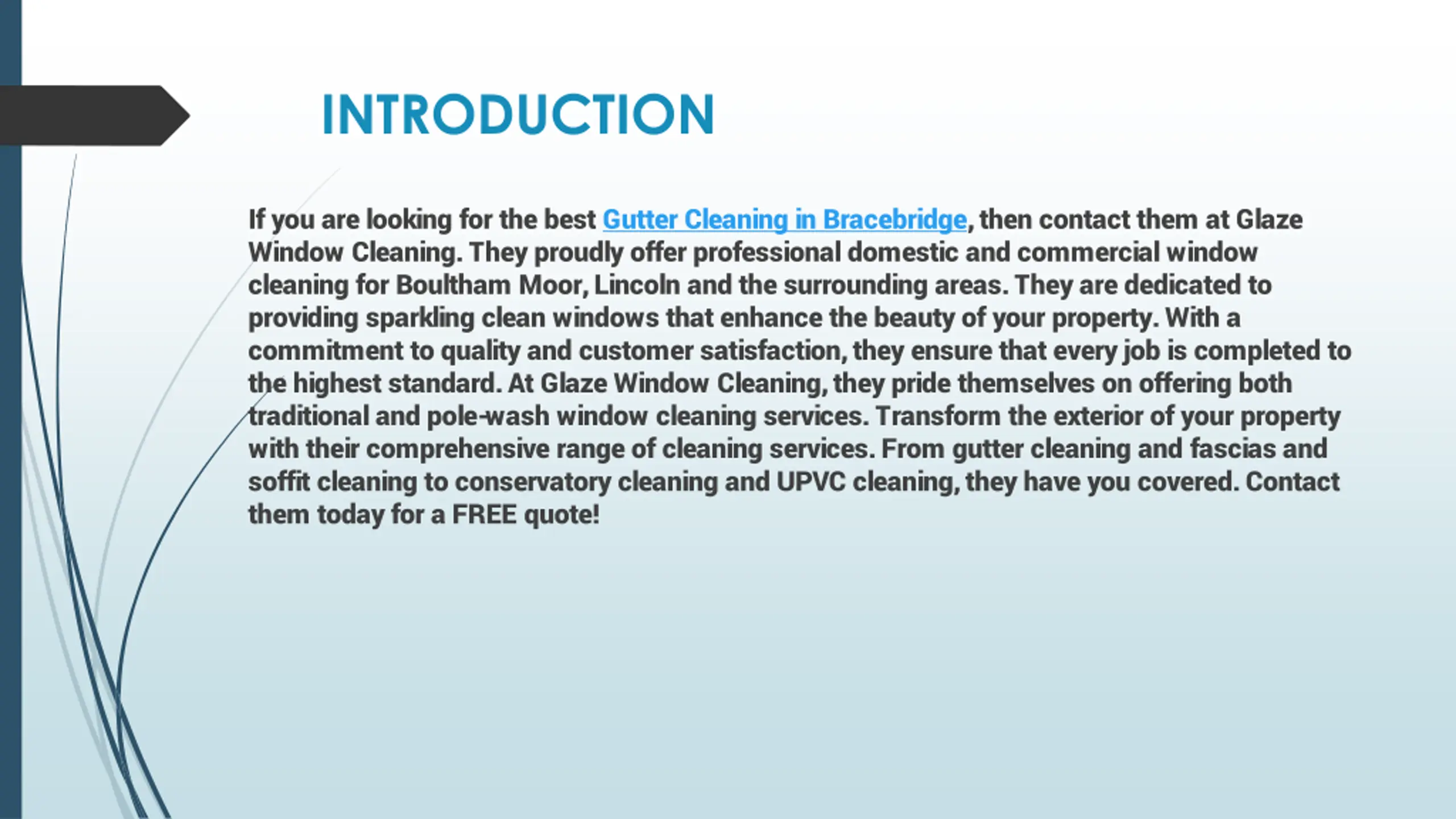 INTRODUCTION If you are looking for the best Gutter Cleaning in Bracebridge, then contact them at Glaze Window Cleaning. They proudly offer professional domestic and commercial window cleaning for Boultham Moor, Lincoln and the surrounding areas. They are dedicated to providing sparkling clean windows that enhance the beauty of your property. With a commitment to quality and customer satisfaction, they ensure that every job is completed to the highest standard. At Glaze Window Cleaning, they pride themselves on offering both traditional and pole-wash window cleaning services. Transform the exterior of your property with their comprehensive range of cleaning services. From gutter cleaning and fascias and soffit cleaning to conservatory cleaning and UPVC cleaning, they have you covered. Contact them today for a FREE quote!
