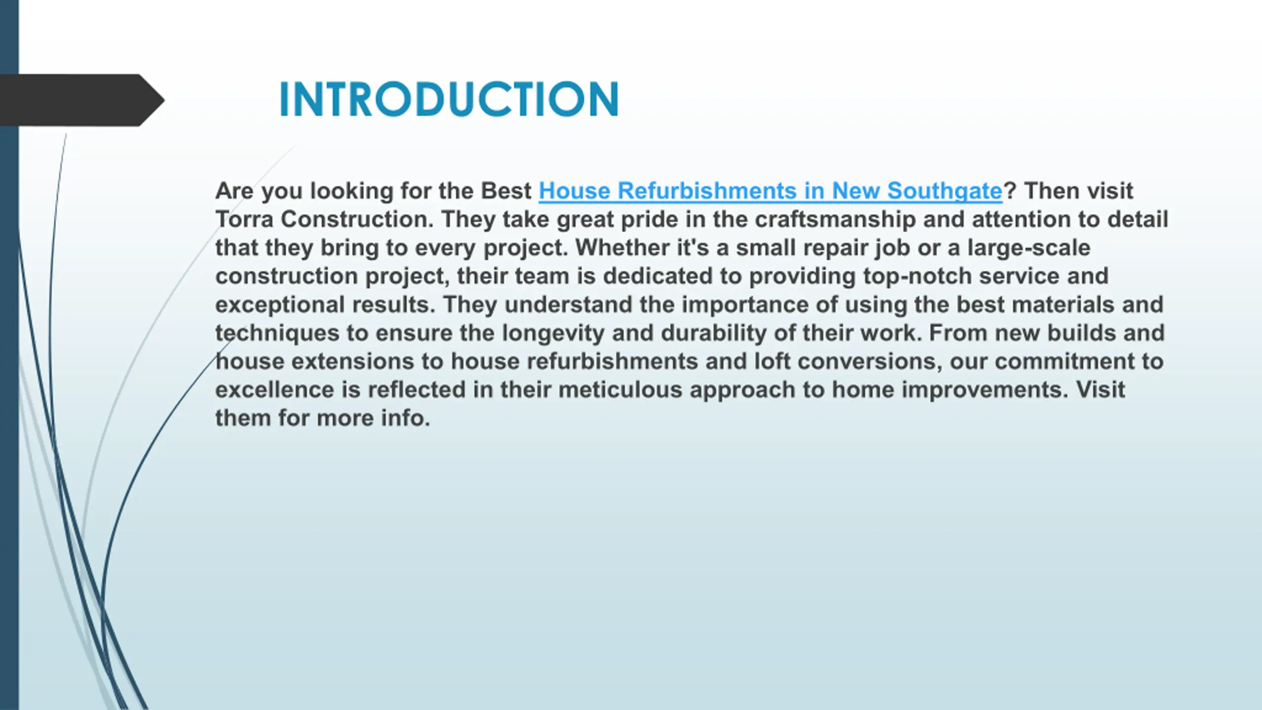 2. INTRODUCTION Are you looking for the Best House Refurbishments in New Southgate? Then visit Torra Construction. They take great pride in the craftsmanship and attention to detail that they bring to every project. Whether it's a small repair job or a large-scale construction project, their team is dedicated to providing top-notch service and exceptional results. They understand the importance of using the best materials and techniques to ensure the longevity and durability of their work. From new builds and house extensions to house refurbishments and loft conversions, our commitment to excellence is reflected in their meticulous approach to home improvements. Visit them for more info.