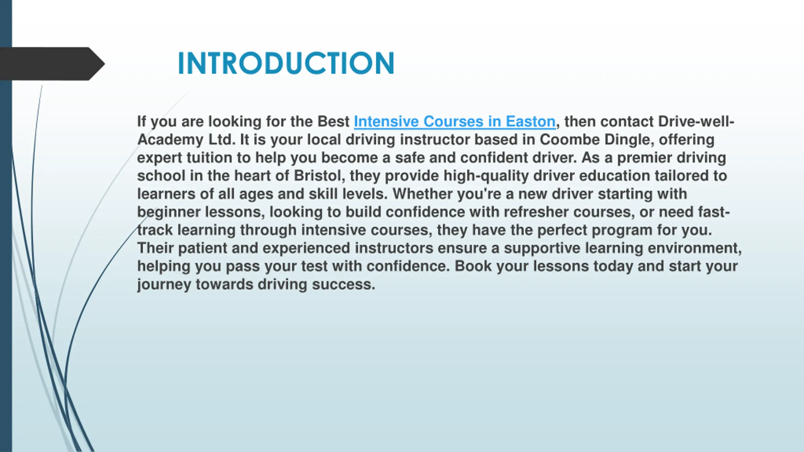INTRODUCTION If you are looking for the Best Intensive Courses in Easton, then contact Drive-well- Academy Ltd. It is your local driving instructor based in Coombe Dingle, offering expert tuition to help you become a safe and confident driver. As a premier driving school in the heart of Bristol, they provide high-quality driver education tailored to learners of all ages and skill levels. Whether you're a new driver starting with beginner lessons, looking to build confidence with refresher courses, or need fast- track learning through intensive courses, they have the perfect program for you. Their patient and experienced instructors ensure a supportive learning environment, helping you pass your test with confidence. Book your lessons today and start your journey towards driving success.