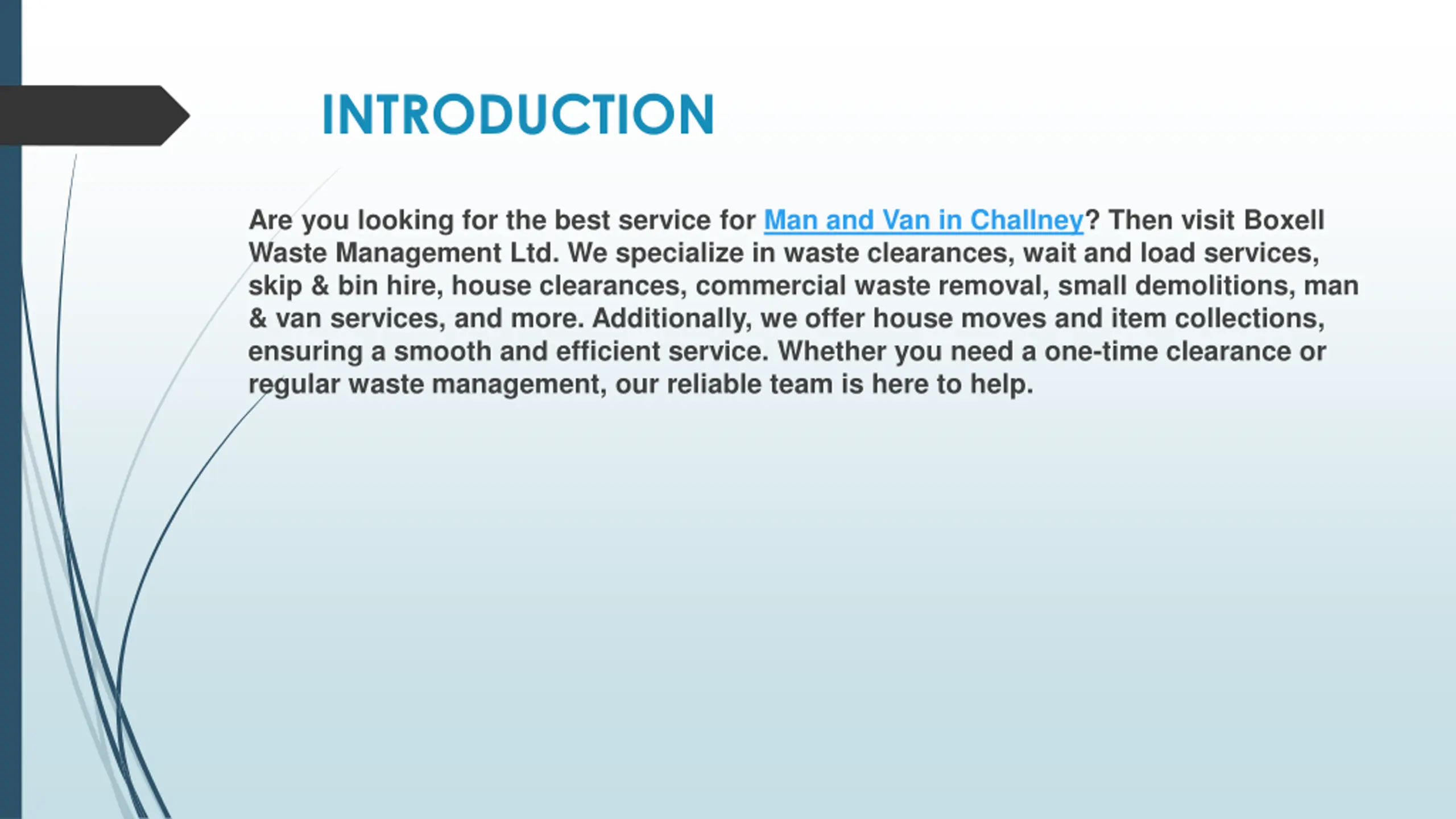 INTRODUCTION Are you looking for the best service for Man and Van in Challney? Then visit Boxell Waste Management Ltd. We specialize in waste clearances, wait and load services, skip & bin hire, house clearances, commercial waste removal, small demolitions, man & van services, and more. Additionally, we offer house moves and item collections, ensuring a smooth and efficient service. Whether you need a one-time clearance or regular waste management, our reliable team is here to help.