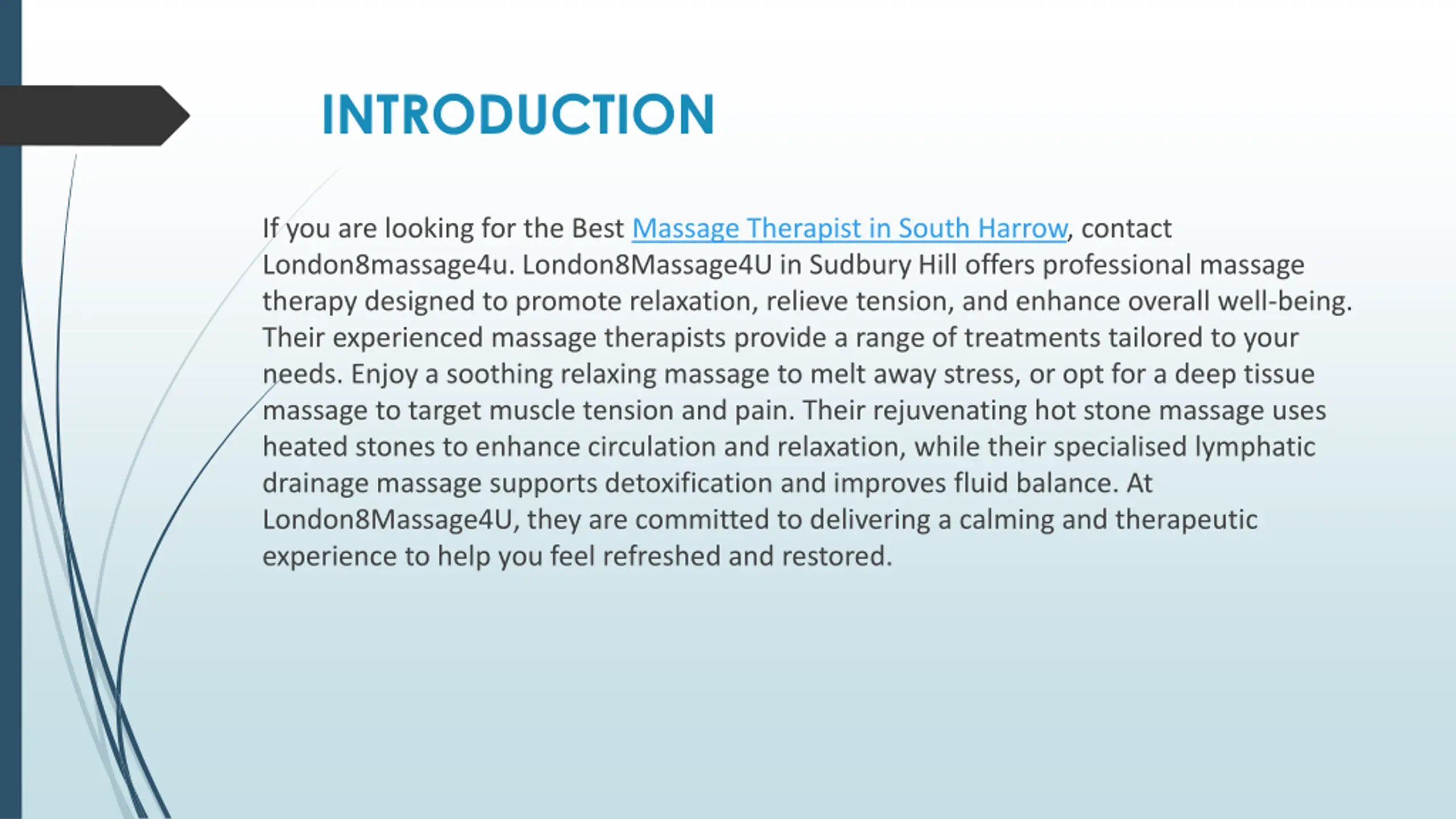 INTRODUCTION If you are looking for the Best Massage Therapist in South Harrow, contact London8massage4u. London8Massage4U in Sudbury Hill offers professional massage therapy designed to promote relaxation, relieve tension, and enhance overall well-being. Their experienced massage therapists provide a range of treatments tailored to your needs. Enjoy a soothing relaxing massage to melt away stress, or opt for a deep tissue massage to target muscle tension and pain. Their rejuvenating hot stone massage uses heated stones to enhance circulation and relaxation, while their specialised lymphatic drainage massage supports detoxification and improves fluid balance. At London8Massage4U, they are committed to delivering a calming and therapeutic experience to help you feel refreshed and restored.