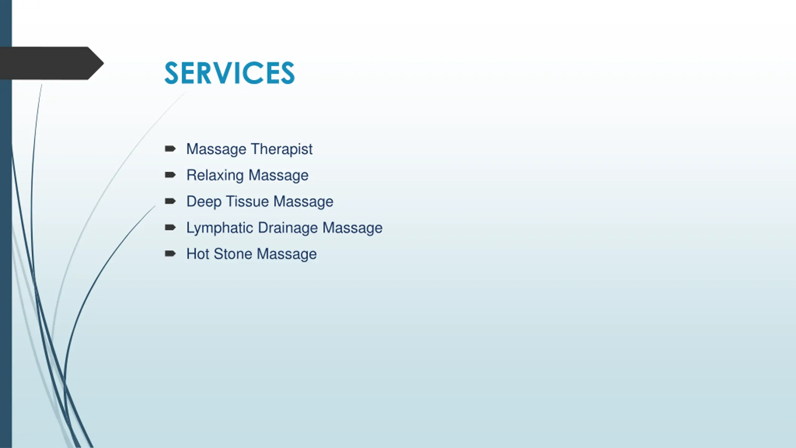 SERVICES Massage Therapist Relaxing Massage Deep Tissue Massage Lymphatic Drainage Massage Hot Stone Massage