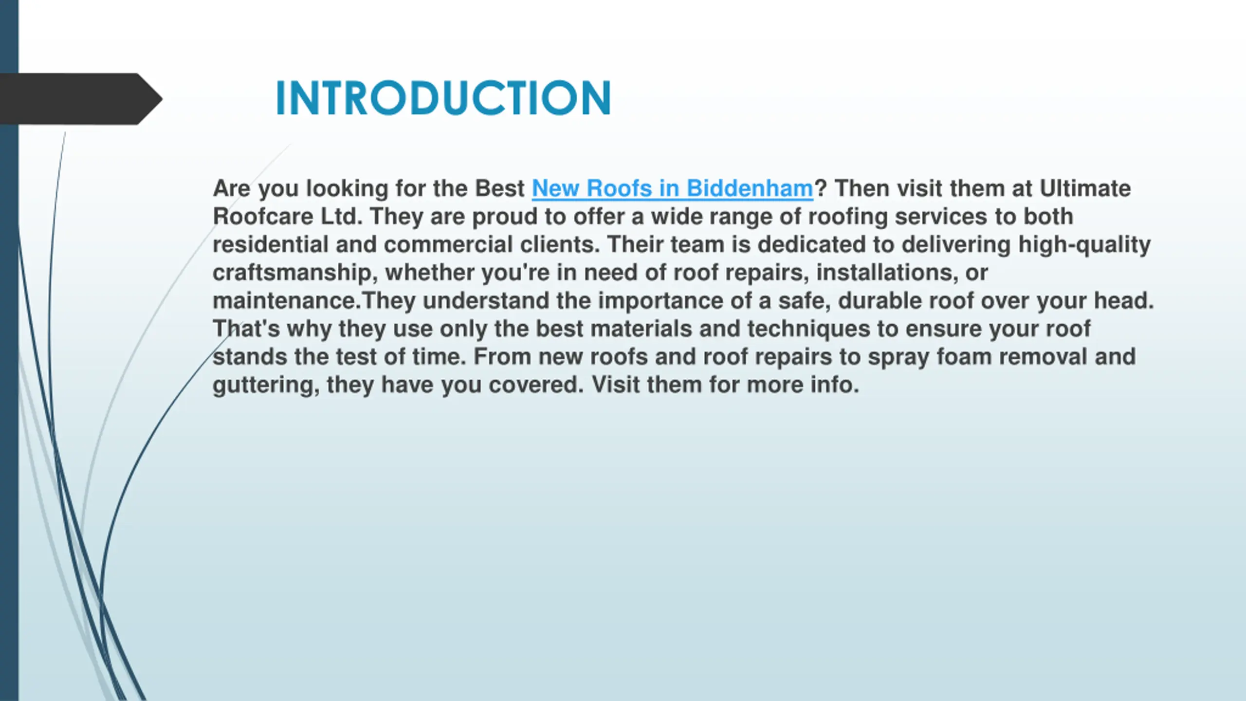 INTRODUCTION Are you looking for the Best New Roofs in Biddenham? Then visit them at Ultimate Roofcare Ltd. They are proud to offer a wide range of roofing services to both residential and commercial clients. Their team is dedicated to delivering high-quality craftsmanship, whether you're in need of roof repairs, installations, or maintenance.They understand the importance of a safe, durable roof over your head. That's why they use only the best materials and techniques to ensure your roof stands the test of time. From new roofs and roof repairs to spray foam removal and guttering, they have you covered. Visit them for more info.