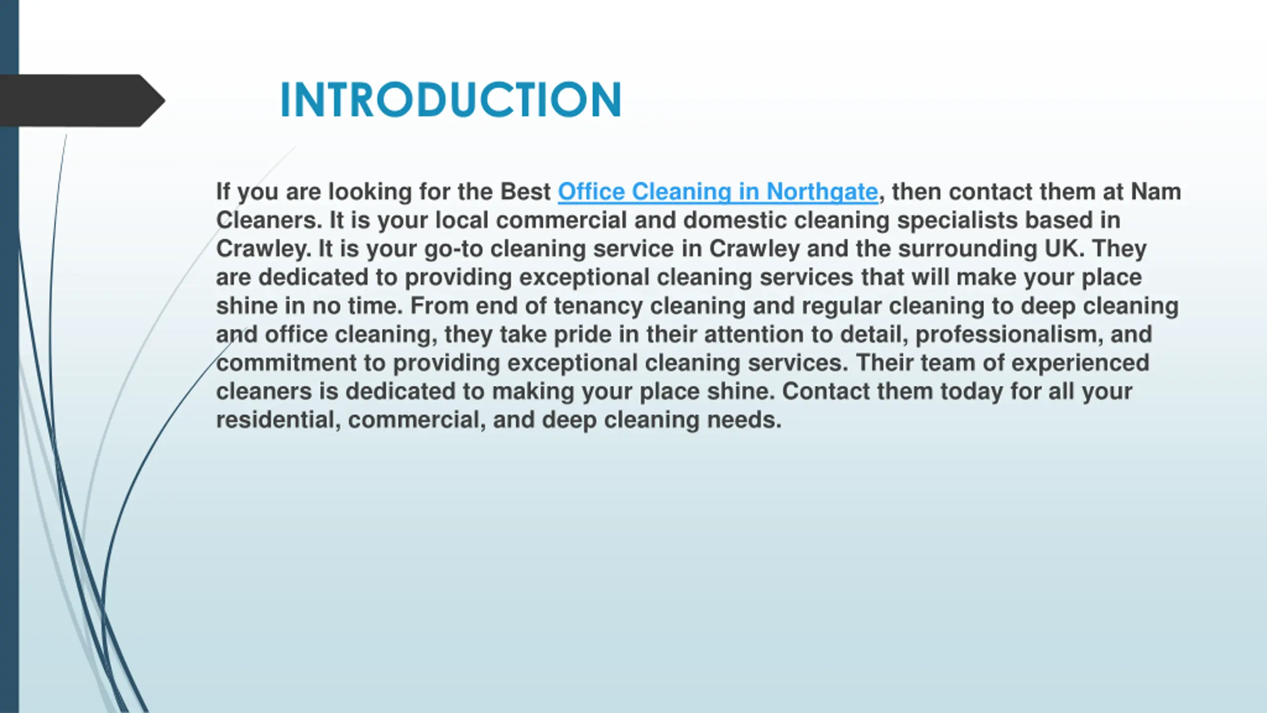 INTRODUCTION If you are looking for the Best Office Cleaning in Northgate, then contact them at Nam Cleaners. It is your local commercial and domestic cleaning specialists based in Crawley. It is your go-to cleaning service in Crawley and the surrounding UK. They are dedicated to providing exceptional cleaning services that will make your place shine in no time. From end of tenancy cleaning and regular cleaning to deep cleaning and office cleaning, they take pride in their attention to detail, professionalism, and commitment to providing exceptional cleaning services. Their team of experienced cleaners is dedicated to making your place shine. Contact them today for all your residential, commercial, and deep cleaning needs.