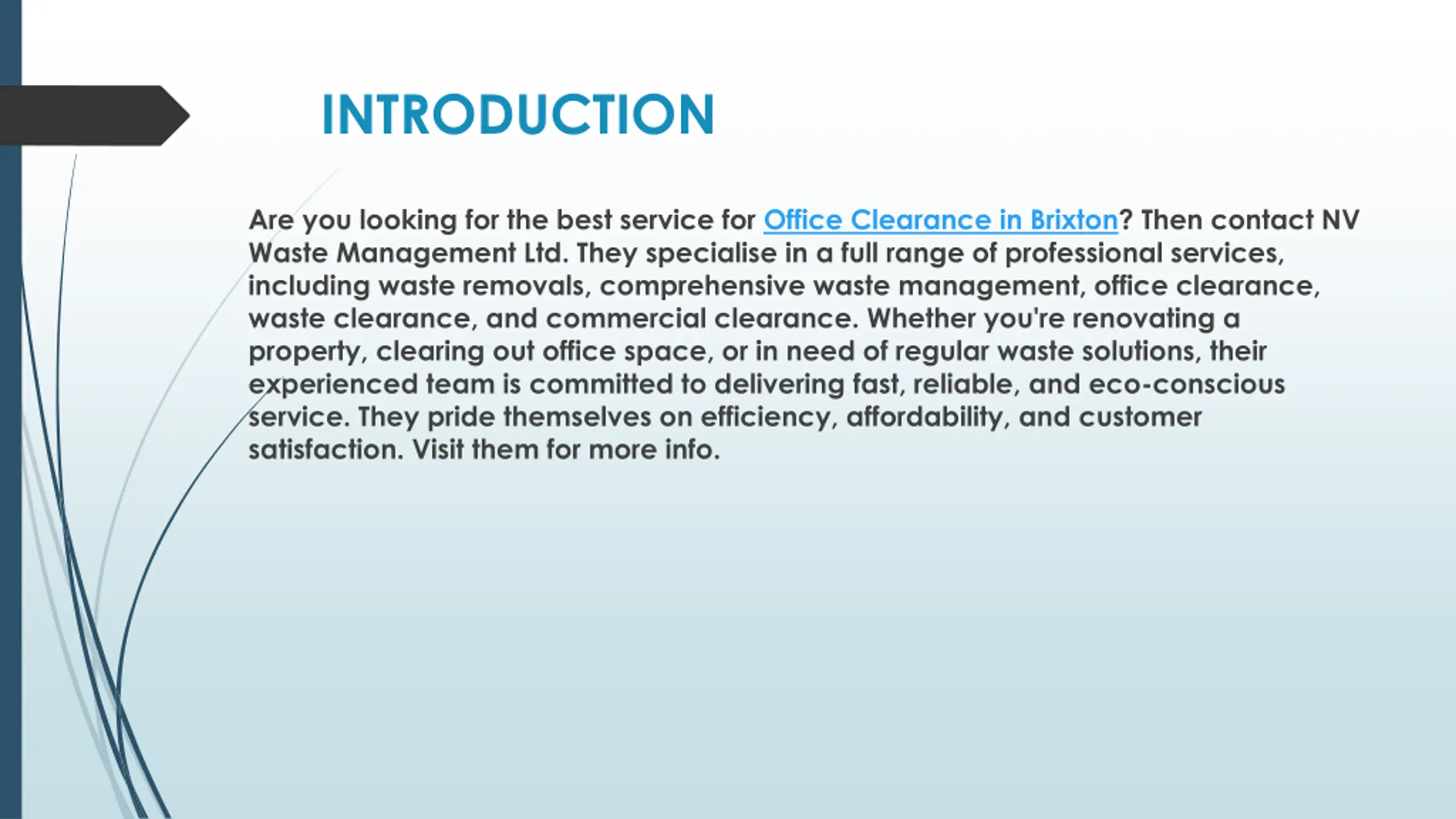 INTRODUCTION Are you looking for the best service for Office Clearance in Brixton? Then contact NV Waste Management Ltd. They specialise in a full range of professional services, including waste removals, comprehensive waste management, office clearance, waste clearance, and commercial clearance. Whether you're renovating a property, clearing out office space, or in need of regular waste solutions, their experienced team is committed to delivering fast, reliable, and eco-conscious service. They pride themselves on efficiency, affordability, and customer satisfaction. Visit them for more info.