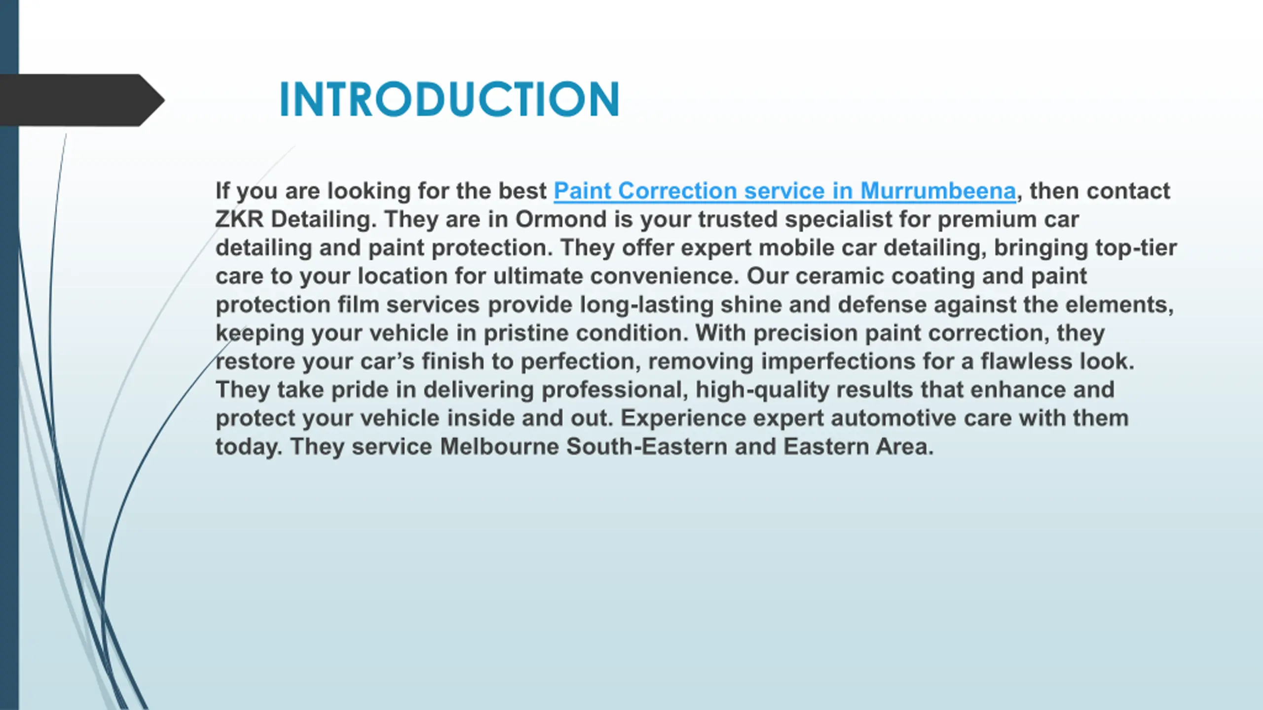 INTRODUCTION If you are looking for the best Paint Correction service in Murrumbeena, then contact ZKR Detailing. They are in Ormond is your trusted specialist for premium car detailing and paint protection. They offer expert mobile car detailing, bringing top-tier care to your location for ultimate convenience. Our ceramic coating and paint protection film services provide long-lasting shine and defense against the elements, keeping your vehicle in pristine condition. With precision paint correction, they restore your car s finish to perfection, removing imperfections for a flawless look. They take pride in delivering professional, high-quality results that enhance and protect your vehicle inside and out. Experience expert automotive care with them today. They service Melbourne South-Eastern and Eastern Area.