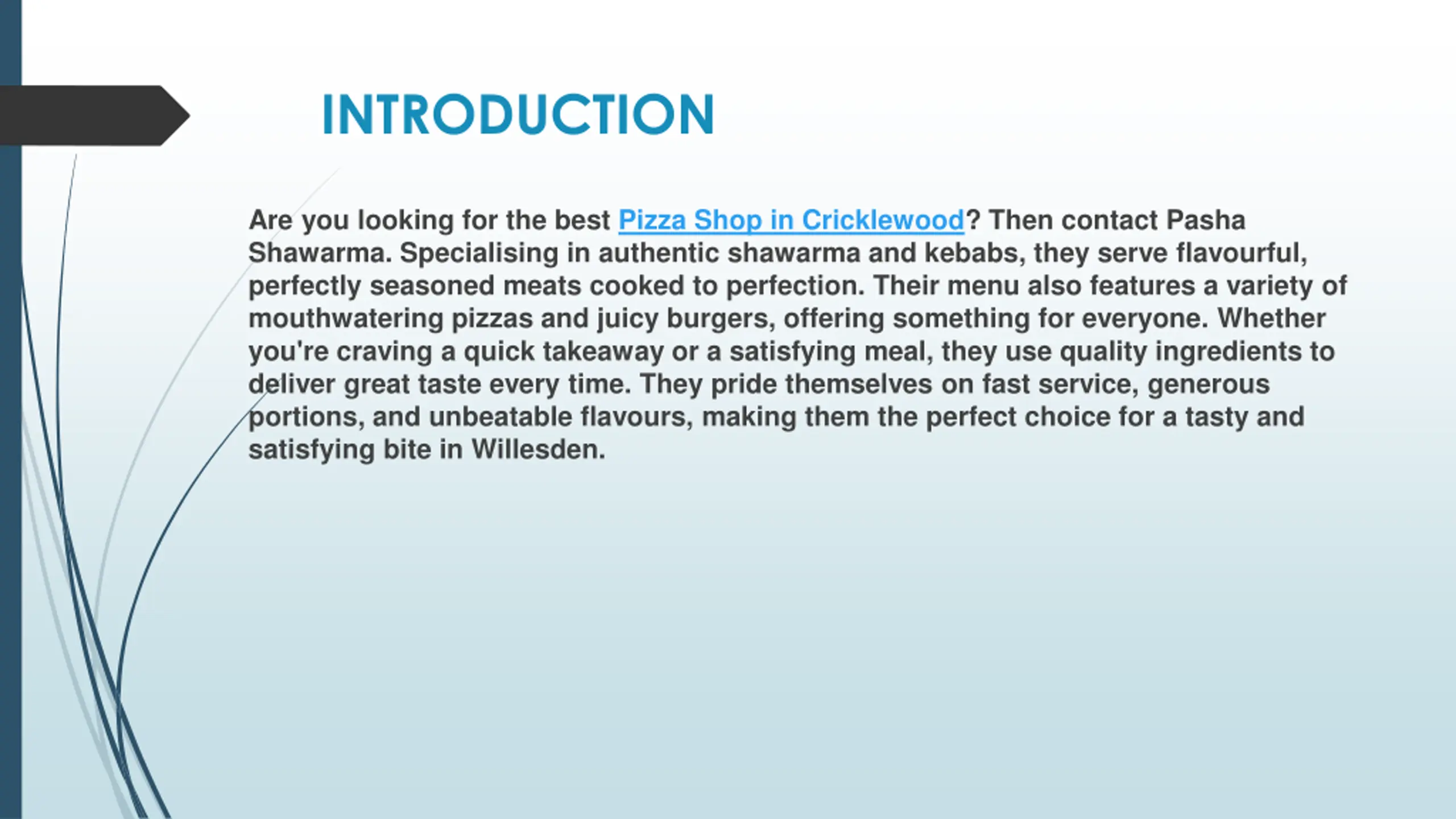 INTRODUCTION Are you looking for the best Pizza Shop in Cricklewood? Then contact Pasha Shawarma. Specialising in authentic shawarma and kebabs, they serve flavourful, perfectly seasoned meats cooked to perfection. Their menu also features a variety of mouthwatering pizzas and juicy burgers, offering something for everyone. Whether you're craving a quick takeaway or a satisfying meal, they use quality ingredients to deliver great taste every time. They pride themselves on fast service, generous portions, and unbeatable flavours, making them the perfect choice for a tasty and satisfying bite in Willesden.
