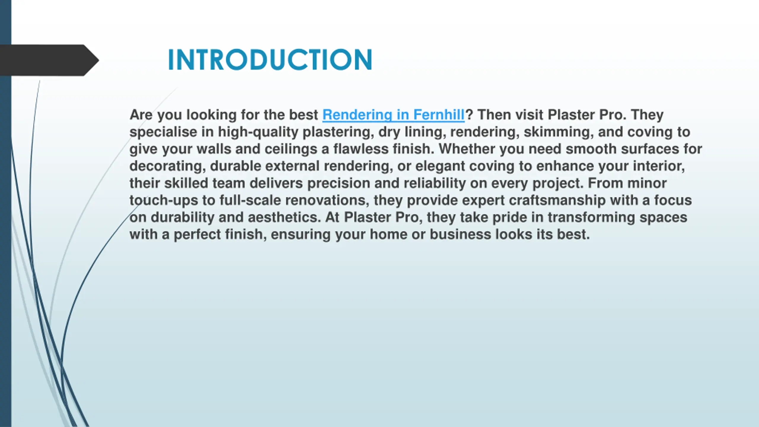 INTRODUCTION Are you looking for the best Rendering in Fernhill? Then visit Plaster Pro. They specialise in high-quality plastering, dry lining, rendering, skimming, and coving to give your walls and ceilings a flawless finish. Whether you need smooth surfaces for decorating, durable external rendering, or elegant coving to enhance your interior, their skilled team delivers precision and reliability on every project. From minor touch-ups to full-scale renovations, they provide expert craftsmanship with a focus on durability and aesthetics. At Plaster Pro, they take pride in transforming spaces with a perfect finish, ensuring your home or business looks its best.