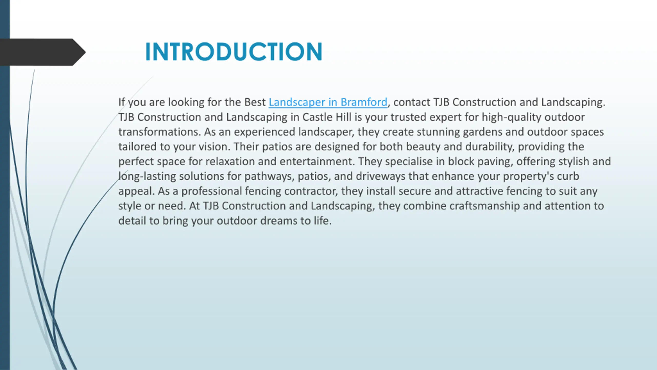 INTRODUCTION If you are looking for the Best Landscaper in Bramford, contact TJB Construction and Landscaping. TJB Construction and Landscaping in Castle Hill is your trusted expert for high-quality outdoor transformations. As an experienced landscaper, they create stunning gardens and outdoor spaces tailored to your vision. Their patios are designed for both beauty and durability, providing the perfect space for relaxation and entertainment. They specialise in block paving, offering stylish and long-lasting solutions for pathways, patios, and driveways that enhance your property's curb appeal. As a professional fencing contractor, they install secure and attractive fencing to suit any style or need. At TJB Construction and Landscaping, they combine craftsmanship and attention to detail to bring your outdoor dreams to life.