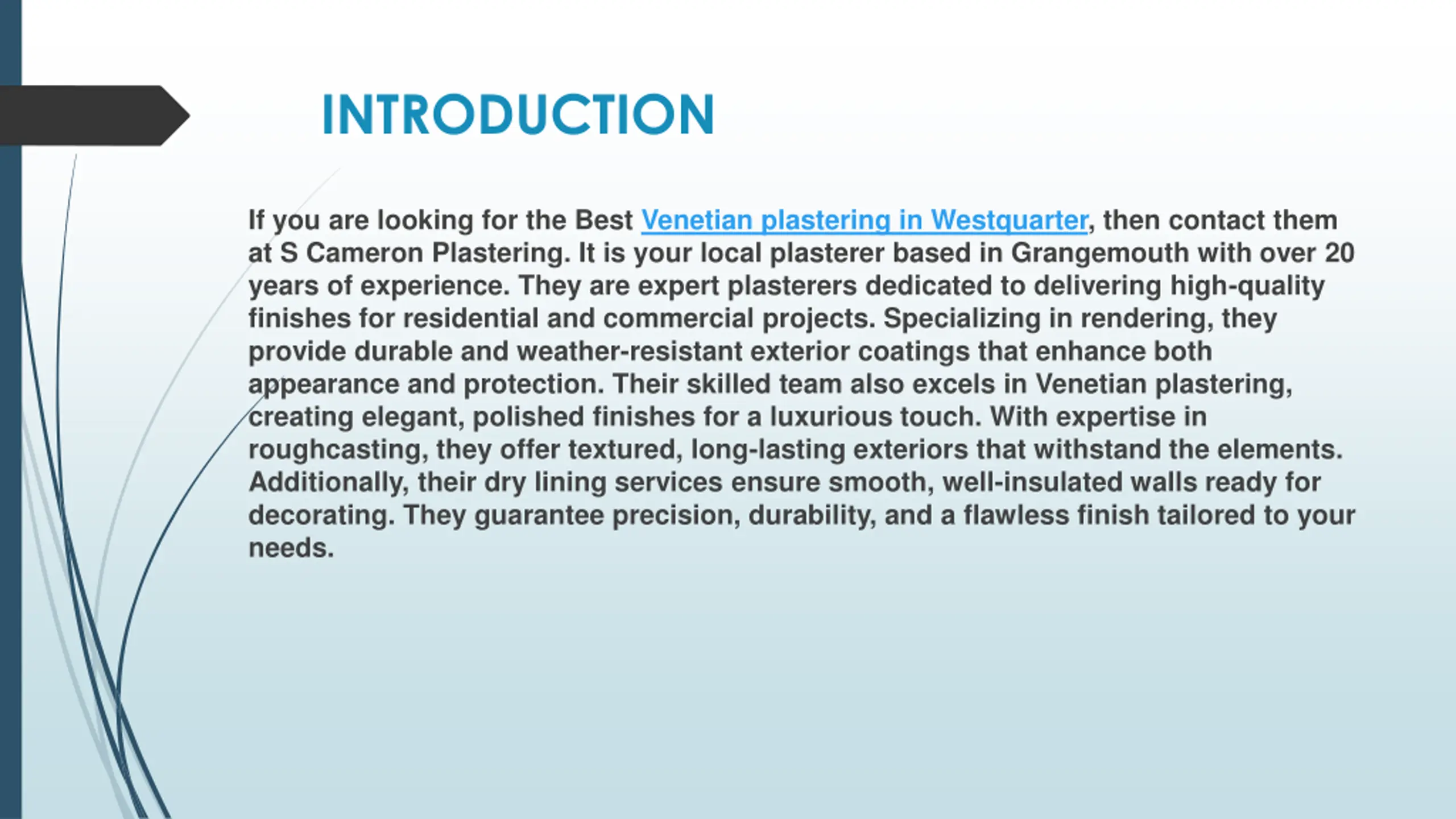 INTRODUCTION If you are looking for the Best Venetian plastering in Westquarter, then contact them at S Cameron Plastering. It is your local plasterer based in Grangemouth with over 20 years of experience. They are expert plasterers dedicated to delivering high-quality finishes for residential and commercial projects. Specializing in rendering, they provide durable and weather-resistant exterior coatings that enhance both appearance and protection. Their skilled team also excels in Venetian plastering, creating elegant, polished finishes for a luxurious touch. With expertise in roughcasting, they offer textured, long-lasting exteriors that withstand the elements. Additionally, their dry lining services ensure smooth, well-insulated walls ready for decorating. They guarantee precision, durability, and a flawless finish tailored to your needs.