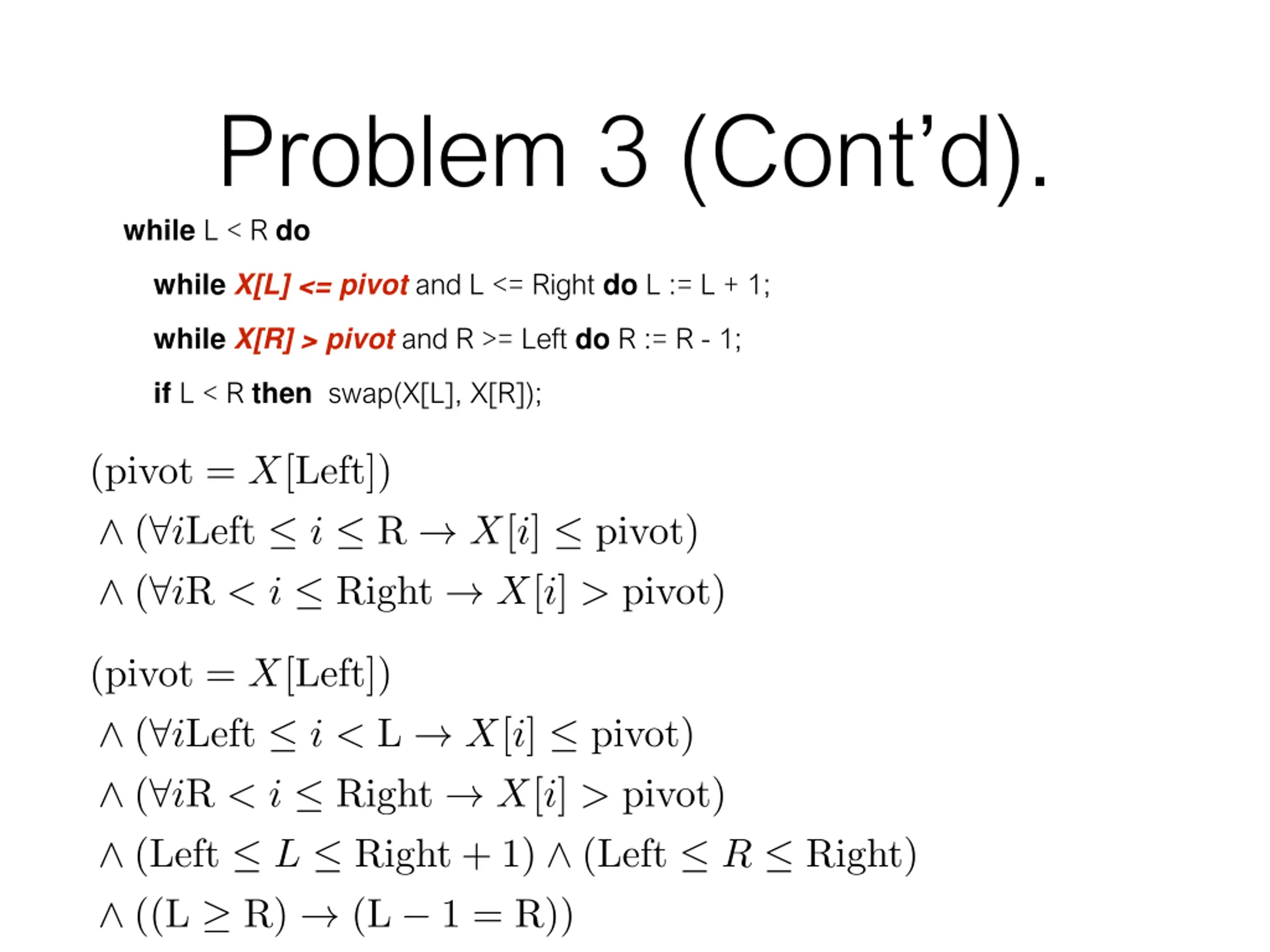 Problem 3 (Contd). Note that the inequalities i < L and R < j in the second and third conjuncts are strict. (we haven t moved pivot yet.) Right, R Left L The fourth & the fifth conjuncts: 4 1 2 3 The last conjunct indicates when the while condition is over.