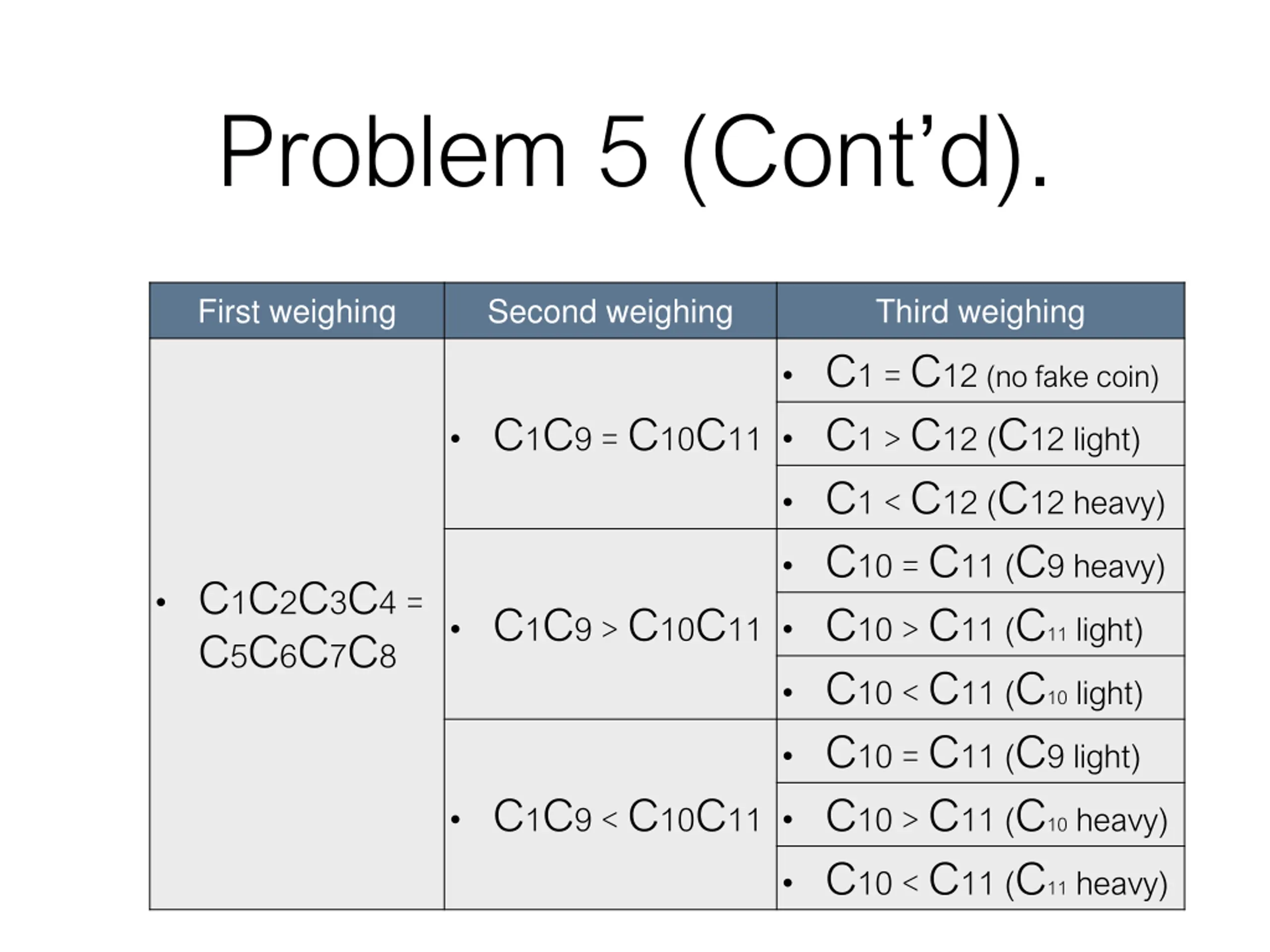 Problem 5 (Contd). First weighing Second weighing Third weighing C7 = C8, C4 ligher C7 > C8, C7 heavy C7 < C8, C8 heavy C3 = C12, C5 heavier C3 > C12, (impossible) C3 < C12, lighter C1 = C2, C6 heavier C1 > C2, C2 lighter C1 < C2, C1 lighter C1C2C5 = C3C6C12 C1C2C3C4 < C5C6C7C8 C1C2C5 > C3C6C12 C1C2C5 < C3C6C12
