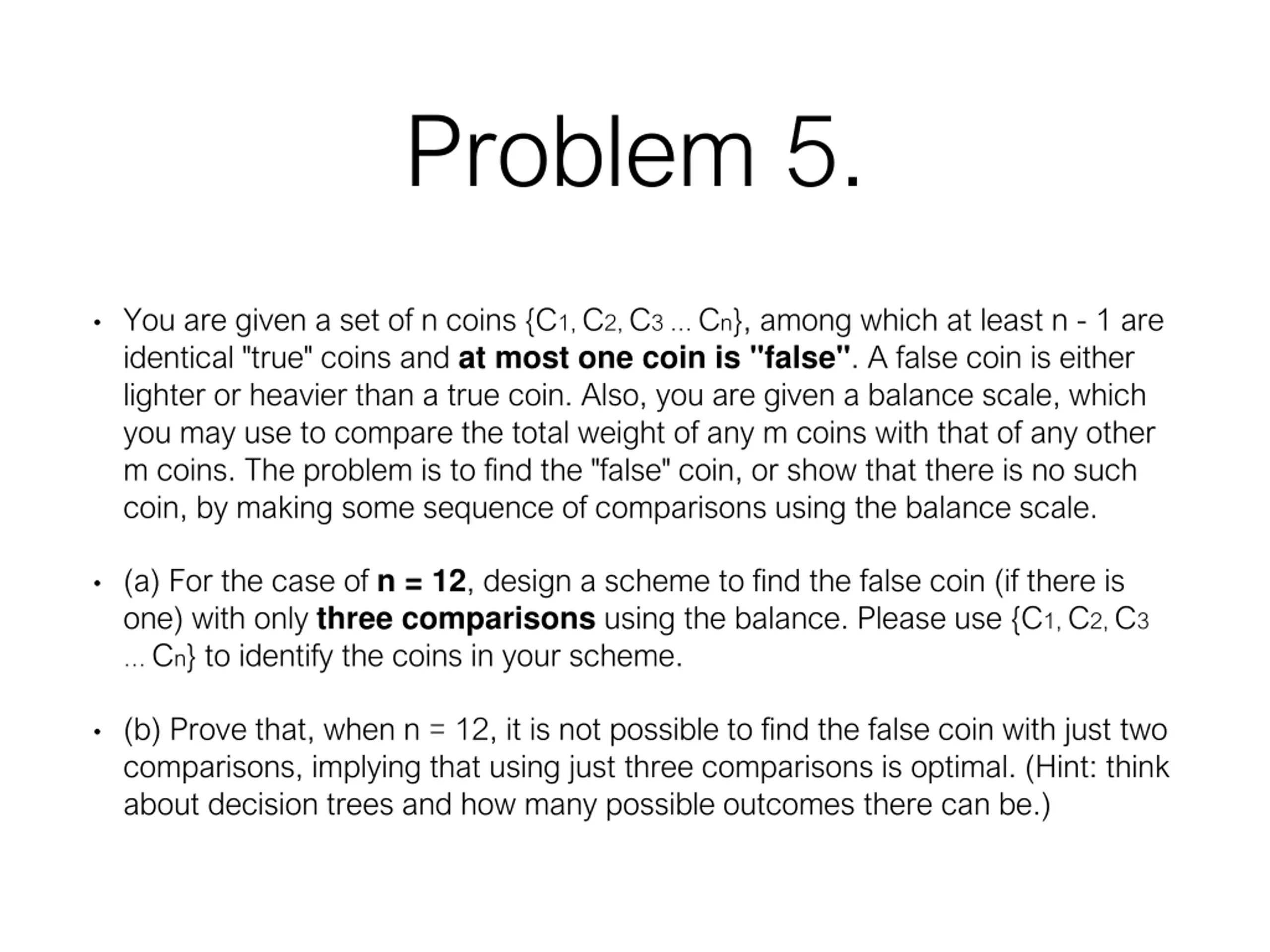 Problem 5. You are given a set of n coins {C1, C2, C3 Cn}, among which at least n - 1 are identical "true" coins and at most one coin is "false". A false coin is either lighter or heavier than a true coin. Also, you are given a balance scale, which you may use to compare the total weight of any m coins with that of any other m coins. The problem is to find the "false" coin, or show that there is no such coin, by making some sequence of comparisons using the balance scale. (a) For the case of n = 12, design a scheme to find the false coin (if there is one) with only three comparisons using the balance. Please use {C1, C2, C3 Cn} to identify the coins in your scheme. (b) Prove that, when n = 12, it is not possible to find the false coin with just two comparisons, implying that using just three comparisons is optimal. (Hint: think about decision trees and how many possible outcomes there can be.)