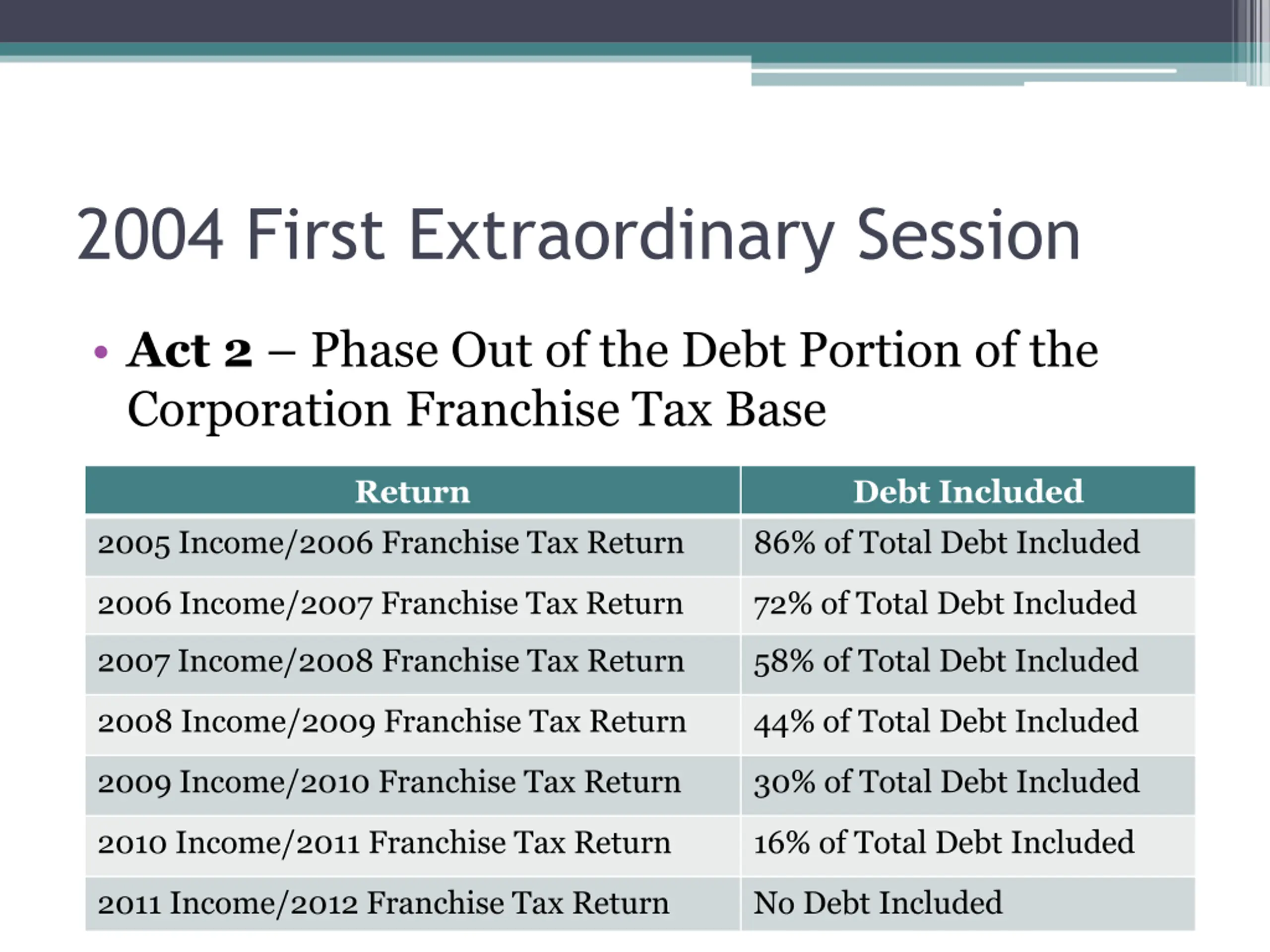 2004 First Extraordinary Session Act 2 Phase Out of the Debt Portion of the Corporation Franchise Tax Base Return Debt Included 86% of Total Debt Included 2005 Income/2006 Franchise Tax Return 2006 Income/2007 Franchise Tax Return 72% of Total Debt Included 2007 Income/2008 Franchise Tax Return 58% of Total Debt Included 2008 Income/2009 Franchise Tax Return 44% of Total Debt Included 2009 Income/2010 Franchise Tax Return 30% of Total Debt Included 2010 Income/2011 Franchise Tax Return 16% of Total Debt Included 2011 Income/2012 Franchise Tax Return No Debt Included
