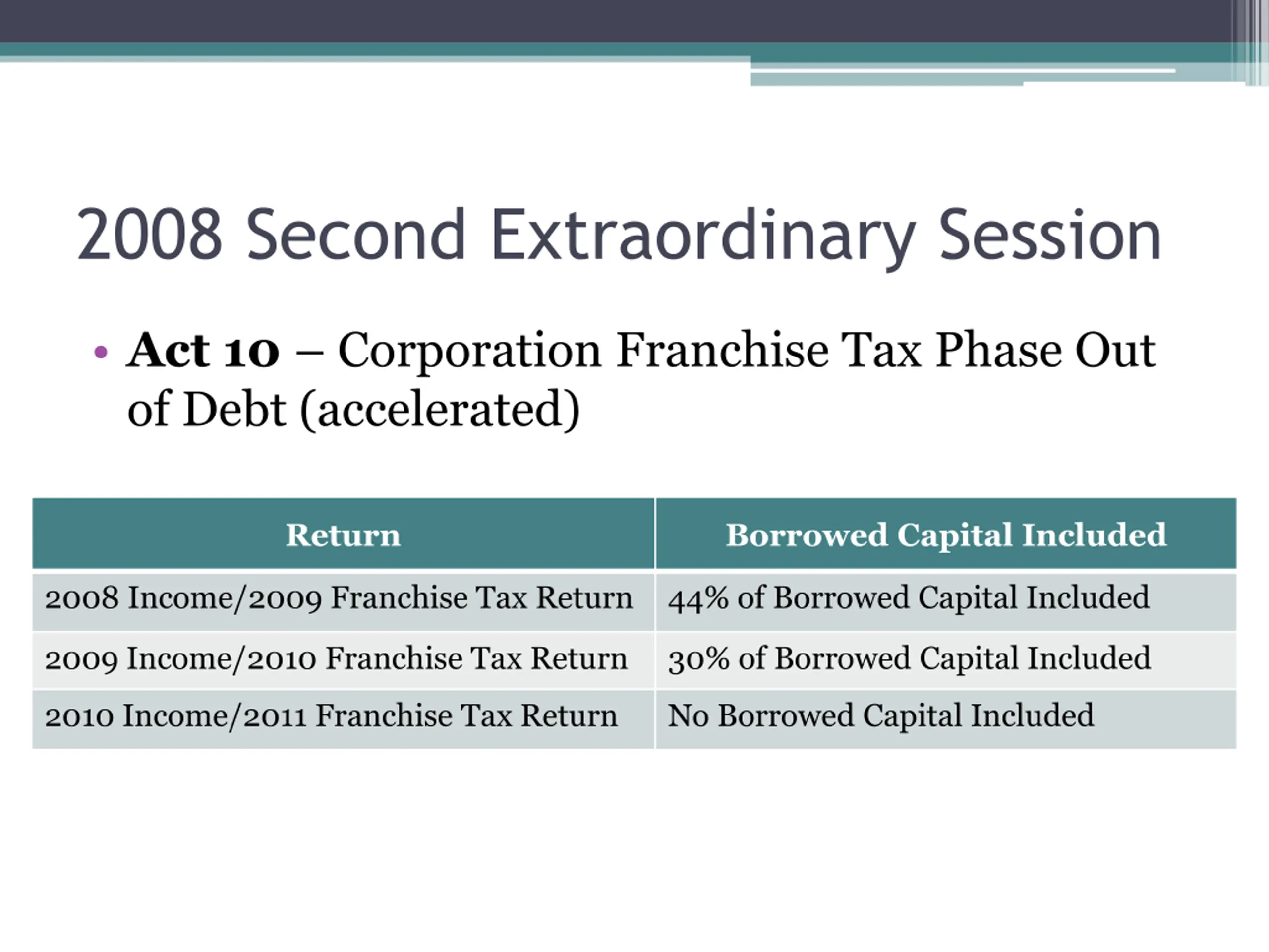 2008 Second Extraordinary Session Act 10 Corporation Franchise Tax Phase Out of Debt (accelerated) Return Borrowed Capital Included 2008 Income/2009 Franchise Tax Return 44% of Borrowed Capital Included 2009 Income/2010 Franchise Tax Return 30% of Borrowed Capital Included 2010 Income/2011 Franchise Tax Return No Borrowed Capital Included
