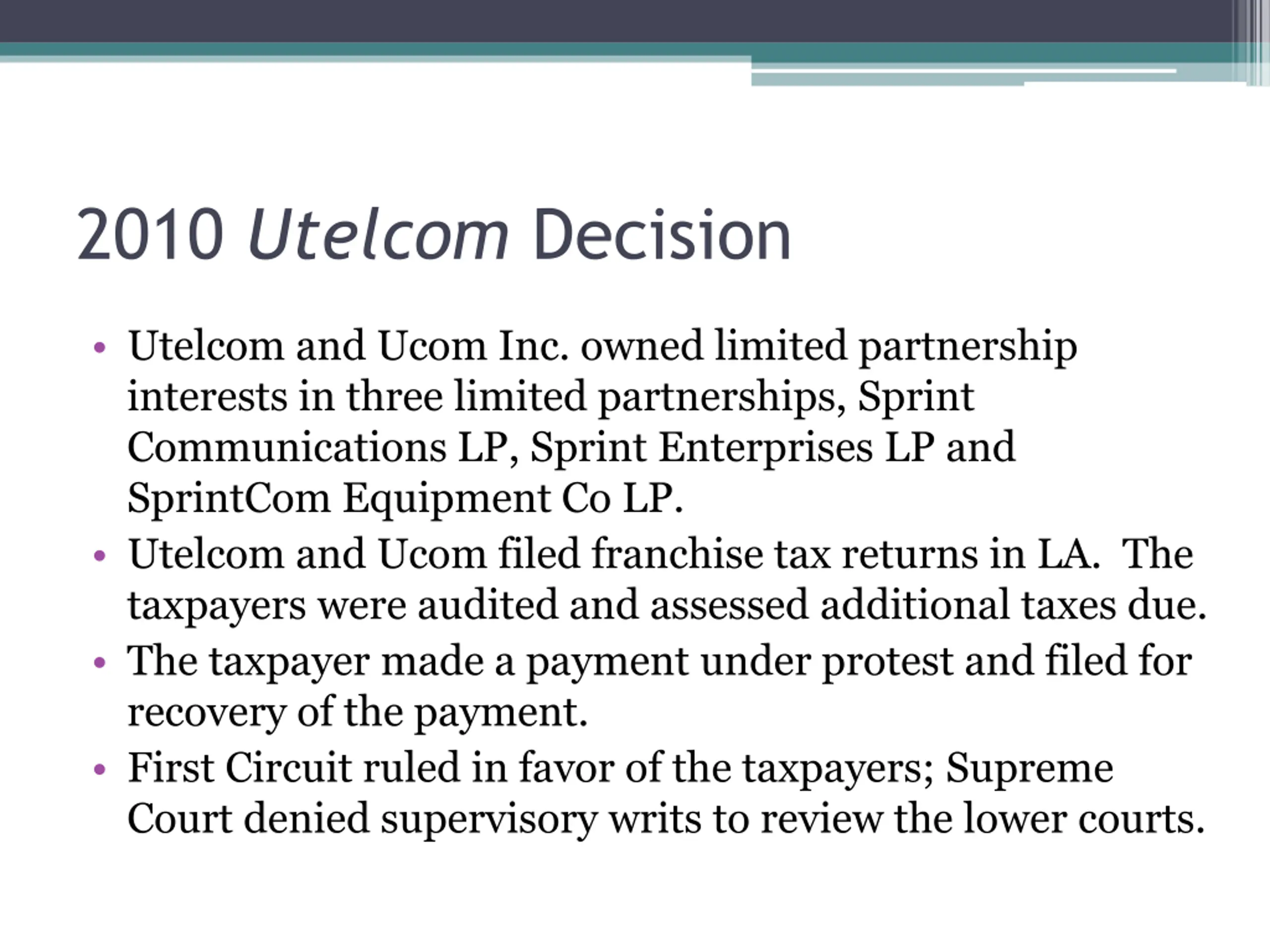 2010 Utelcom Decision Utelcom and Ucom Inc. owned limited partnership interests in three limited partnerships, Sprint Communications LP, Sprint Enterprises LP and SprintCom Equipment Co LP. Utelcom and Ucom filed franchise tax returns in LA. The taxpayers were audited and assessed additional taxes due. The taxpayer made a payment under protest and filed for recovery of the payment. First Circuit ruled in favor of the taxpayers; Supreme Court denied supervisory writs to review the lower courts.