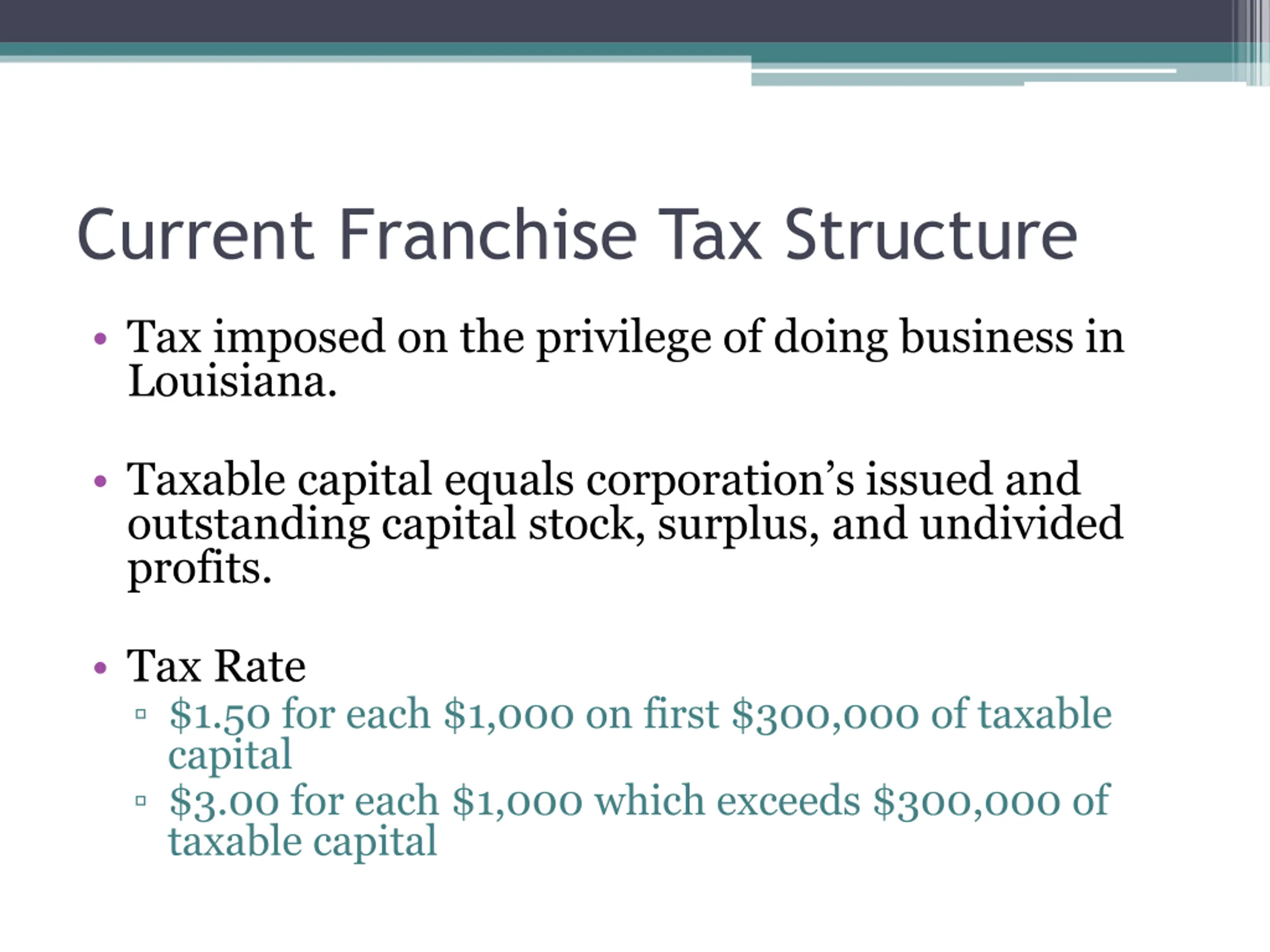 Current Franchise Tax Structure Tax imposed on the privilege of doing business in Louisiana. Taxable capital equals corporation s issued and outstanding capital stock, surplus, and undivided profits. Tax Rate $1.50 for each $1,000 on first $300,000 of taxable capital $3.00 for each $1,000 which exceeds $300,000 of taxable capital