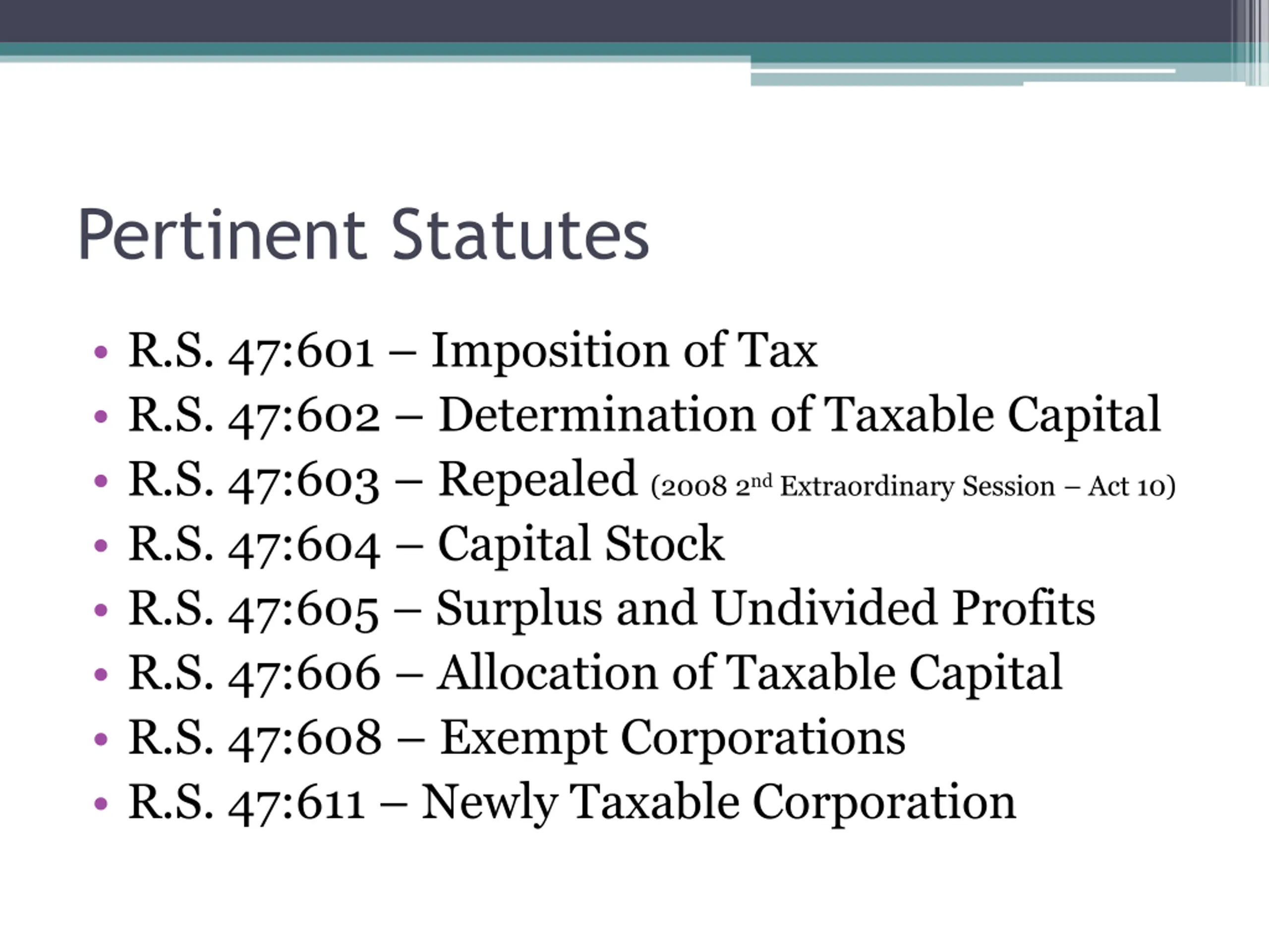 Pertinent Statutes R.S. 47:601 Imposition of Tax R.S. 47:602 Determination of Taxable Capital R.S. 47:603 Repealed (2008 2ndExtraordinary Session Act 10) R.S. 47:604 Capital Stock R.S. 47:605 Surplus and Undivided Profits R.S. 47:606 Allocation of Taxable Capital R.S. 47:608 Exempt Corporations R.S. 47:611 Newly Taxable Corporation