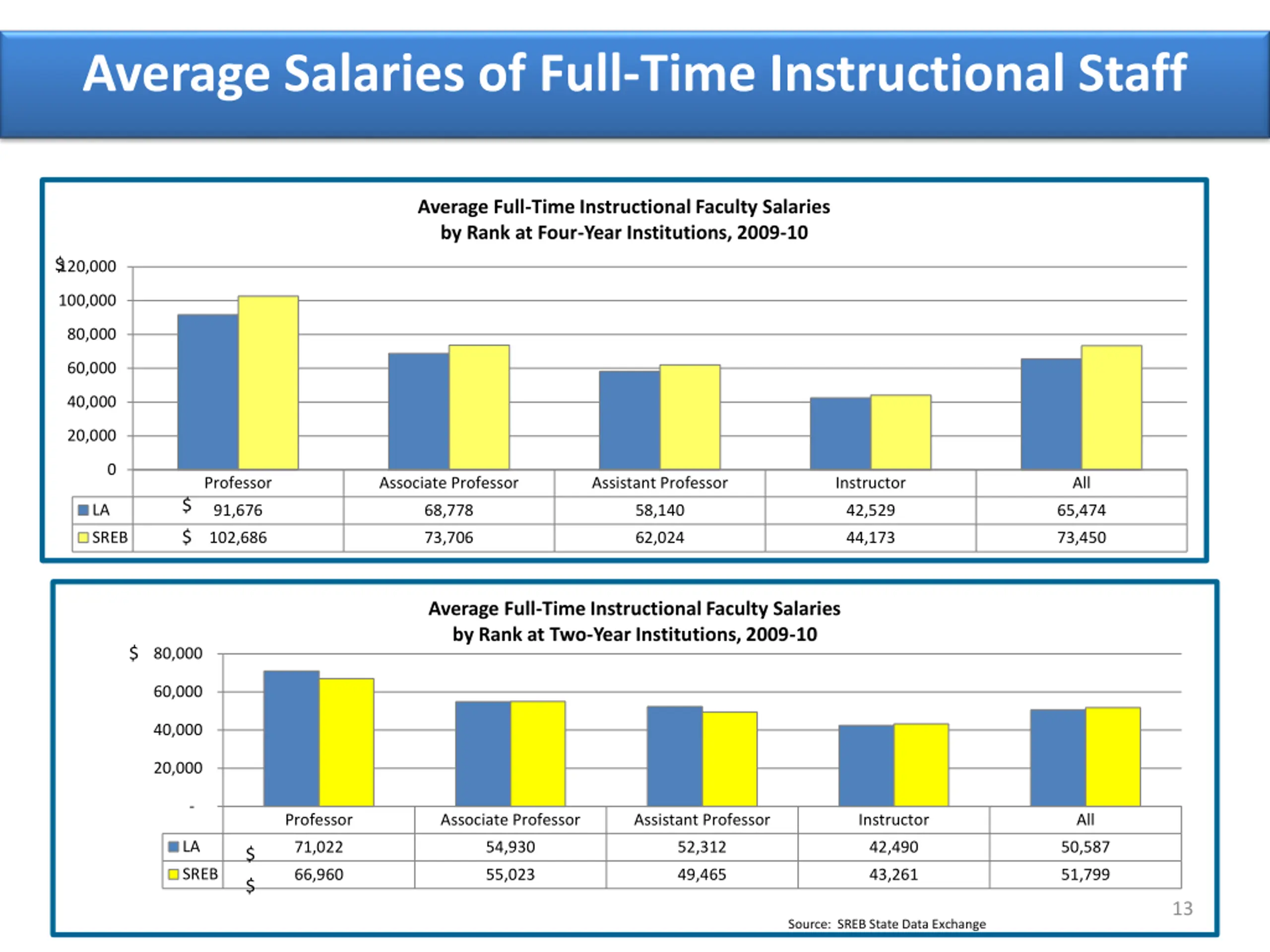 Average Salaries of Full-Time Instructional Staff Average Full-Time Instructional Faculty Salaries by Rank at Four-Year Institutions, 2009-10 120,000 $ 100,000 80,000 60,000 40,000 20,000 0 Professor Associate Professor Assistant Professor Instructor All $ LA 91,676 68,778 58,140 42,529 65,474 $ SREB 102,686 73,706 62,024 44,173 73,450 Average Full-Time Instructional Faculty Salaries by Rank at Two-Year Institutions, 2009-10 $ 80,000 60,000 40,000 20,000 - Professor Associate Professor Assistant Professor Instructor All LA 71,022 54,930 52,312 42,490 50,587 $ SREB 66,960 55,023 49,465 43,261 51,799 $ 13 Source: SREB State Data Exchange