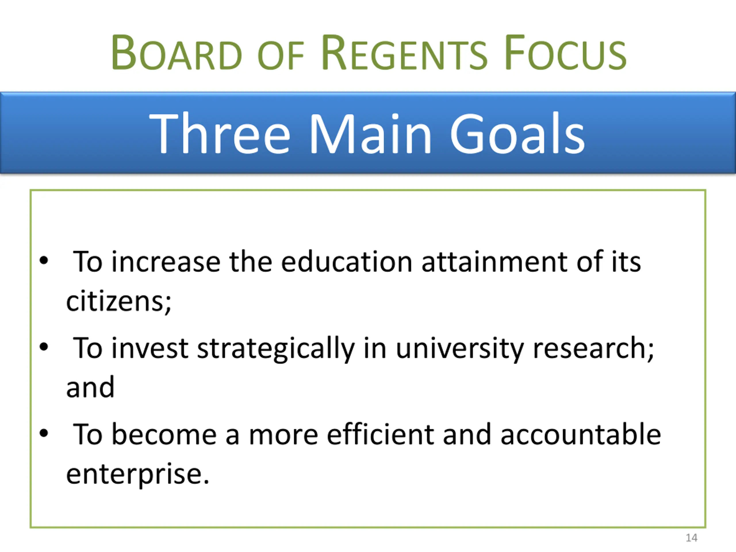 BOARDOF REGENTS FOCUS Three Main Goals To increase the education attainment of its citizens; To invest strategically in university research; and To become a more efficient and accountable enterprise. 14