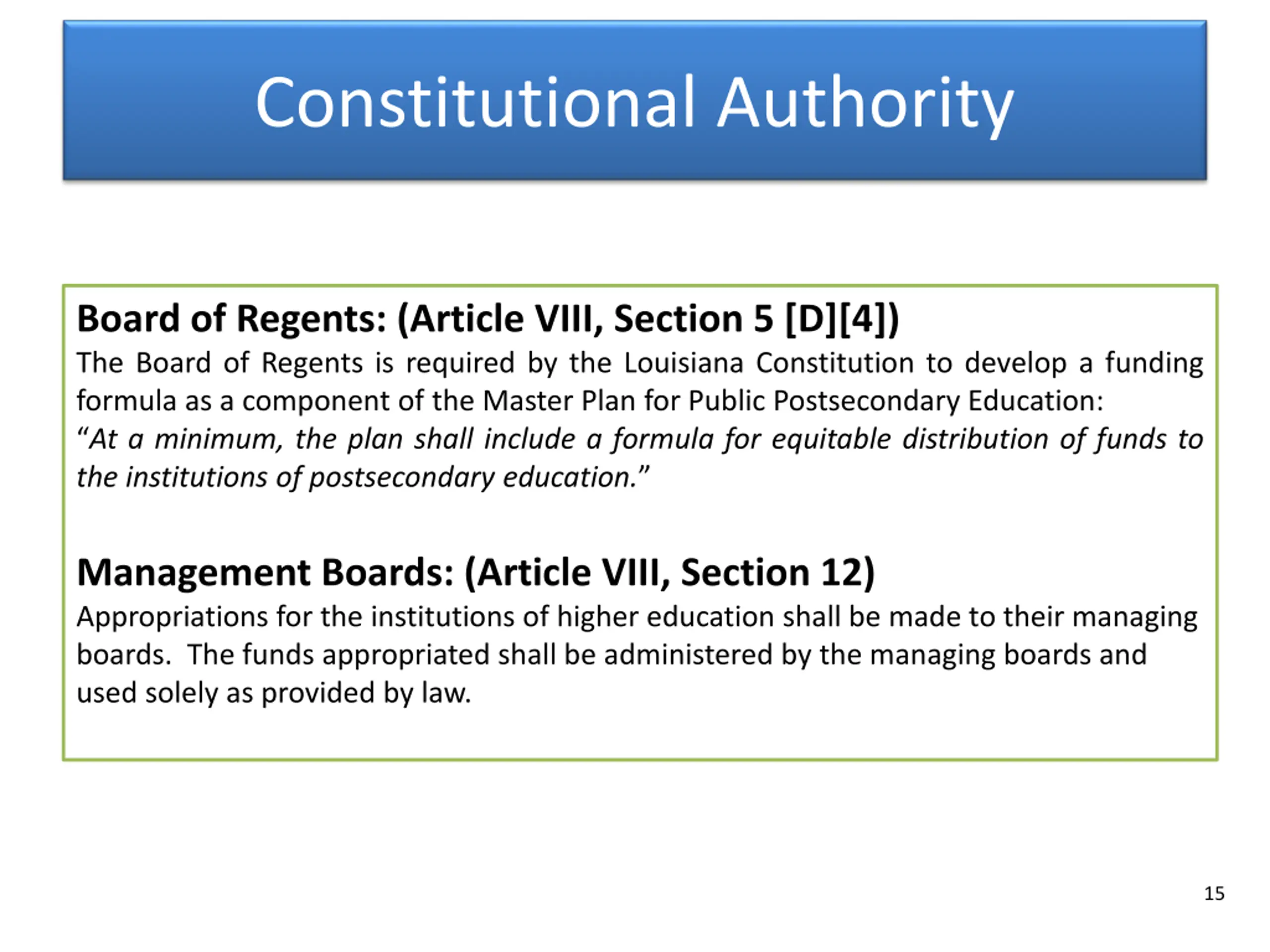 Constitutional Authority Board of Regents: (Article VIII, Section 5 [D][4]) The Board of Regents is required by the Louisiana Constitution to develop a funding formula as a component of the Master Plan for Public Postsecondary Education: At a minimum, the plan shall include a formula for equitable distribution of funds to the institutions of postsecondary education. Management Boards: (Article VIII, Section 12) Appropriations for the institutions of higher education shall be made to their managing boards. The funds appropriated shall be administered by the managing boards and used solely as provided by law. 15
