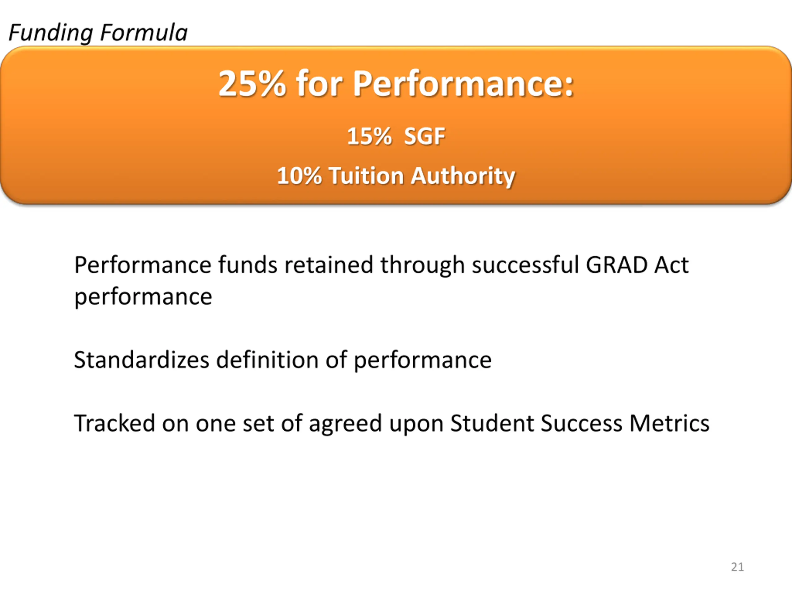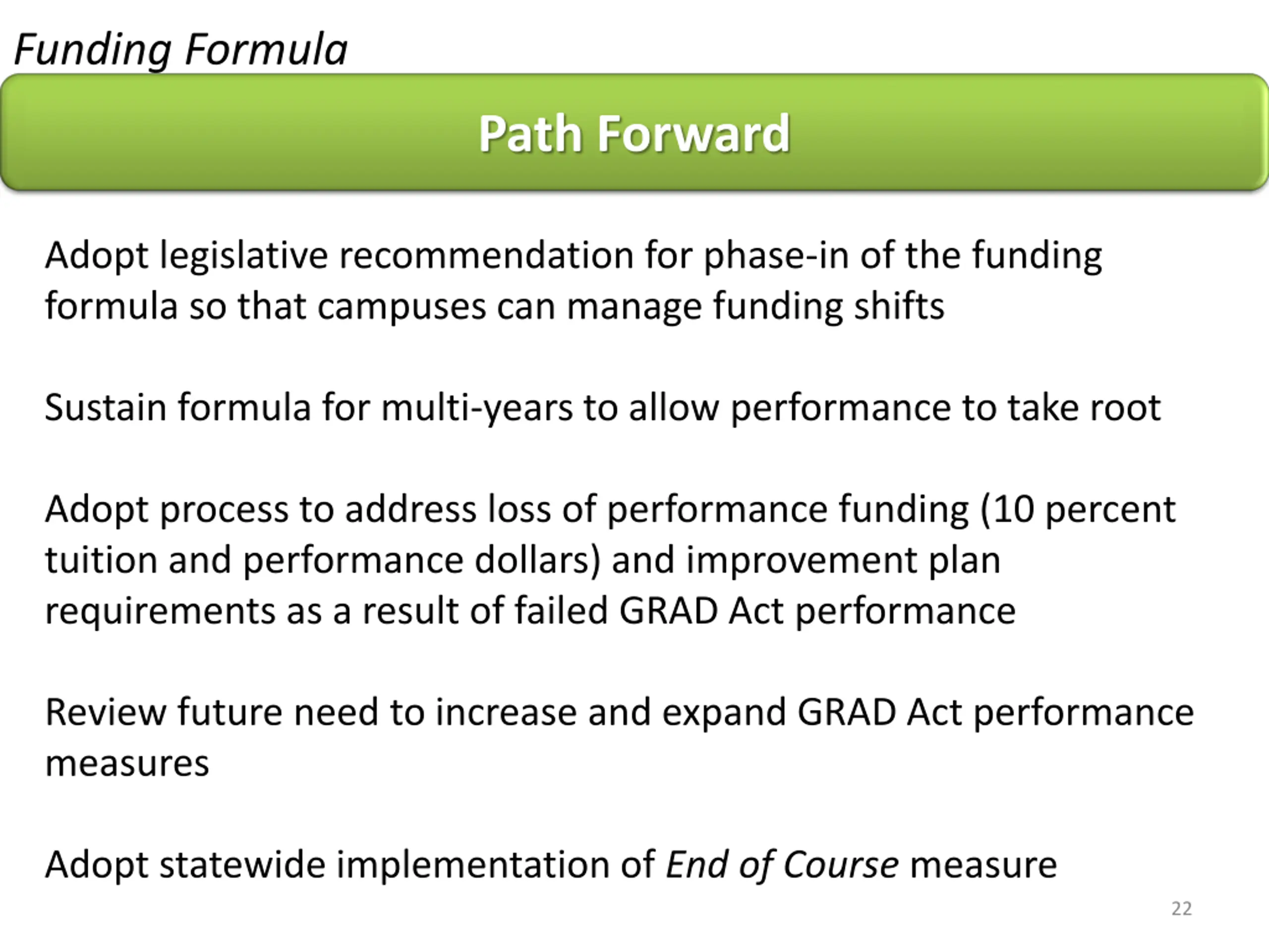 Funding Formula 25% for Performance: 15% SGF 10% Tuition Authority Performance funds retained through successful GRAD Act performance Standardizes definition of performance Tracked on one set of agreed upon Student Success Metrics 21