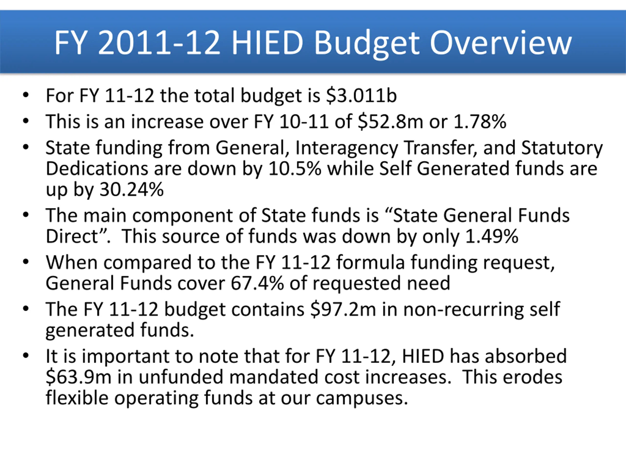 FY 2011-12 HIED Budget Overview For FY 11-12 the total budget is $3.011b This is an increase over FY 10-11 of $52.8m or 1.78% State funding from General, Interagency Transfer, and Statutory Dedications are down by 10.5% while Self Generated funds are up by 30.24% The main component of State funds is State General Funds Direct . This source of funds was down by only 1.49% When compared to the FY 11-12 formula funding request, General Funds cover 67.4% of requested need The FY 11-12 budget contains $97.2m in non-recurring self generated funds. It is important to note that for FY 11-12, HIED has absorbed $63.9m in unfunded mandated cost increases. This erodes flexible operating funds at our campuses.