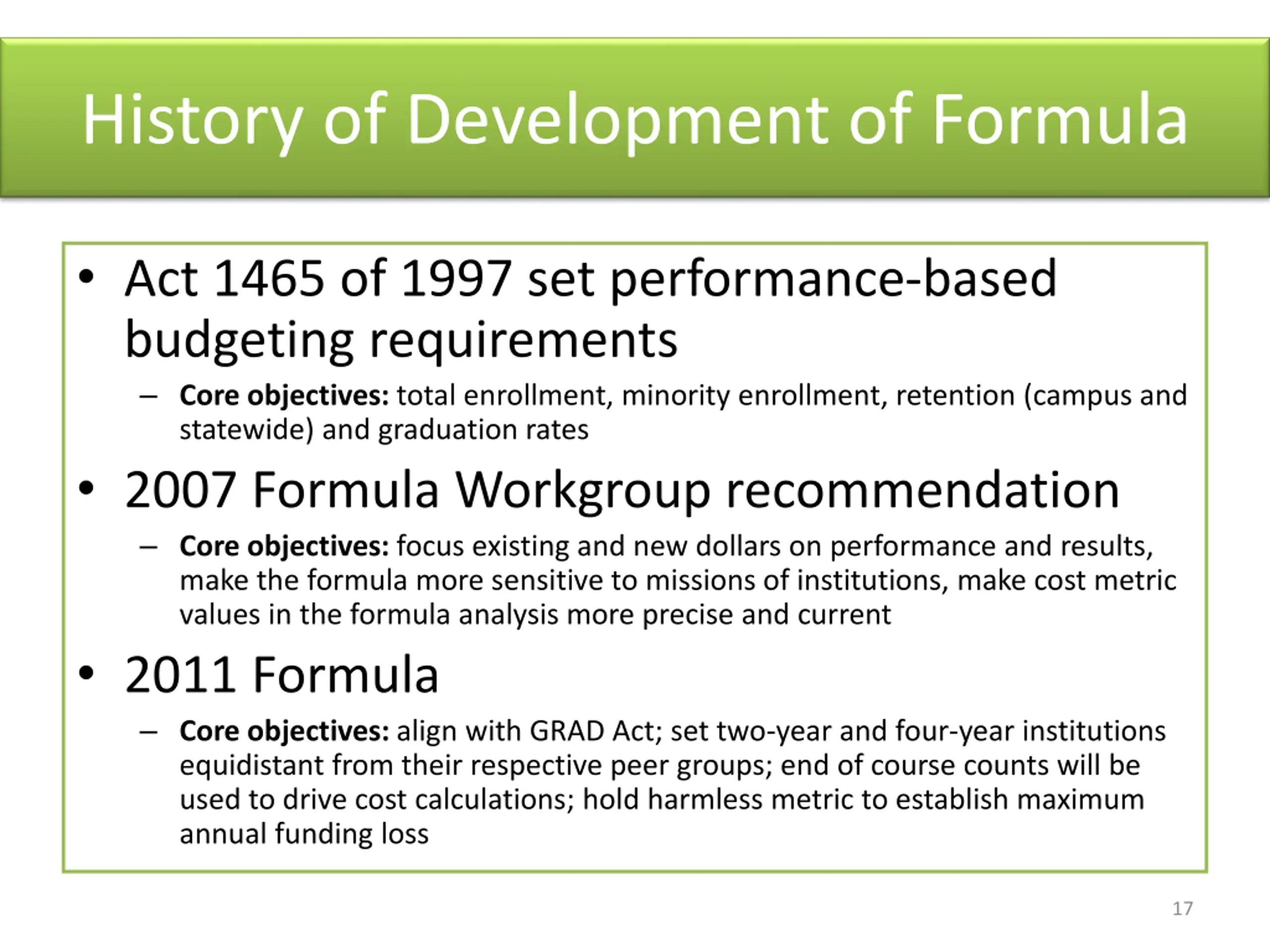 History of Development of Formula Act 1465 of 1997 set performance-based budgeting requirements Core objectives: total enrollment, minority enrollment, retention (campus and statewide) and graduation rates 2007 Formula Workgroup recommendation Core objectives: focus existing and new dollars on performance and results, make the formula more sensitive to missions of institutions, make cost metric values in the formula analysis more precise and current 2011 Formula Core objectives: align with GRAD Act; set two-year and four-year institutions equidistant from their respective peer groups; end of course counts will be used to drive cost calculations; hold harmless metric to establish maximum annual funding loss 17
