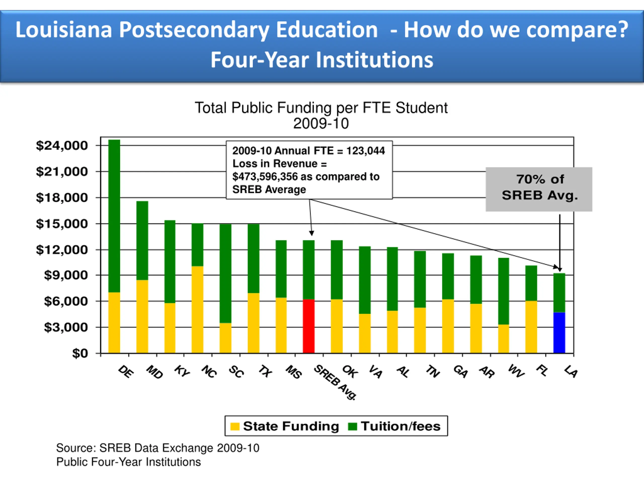 Louisiana Postsecondary Education - How do we compare? Four-Year Institutions Total Public Funding per FTE Student 2009-10 $24,000 2009-10 Annual FTE = 123,044 Loss in Revenue = $473,596,356 as compared to SREB Average $21,000 70% of SREB Avg. $18,000 $15,000 $12,000 $9,000 $6,000 $3,000 $0 SREB Avg. OK GA WV FL DE MD KY NC SC TX MS VA AL TN AR LA State Funding Tuition/fees Source: SREB Data Exchange 2009-10 Public Four-Year Institutions