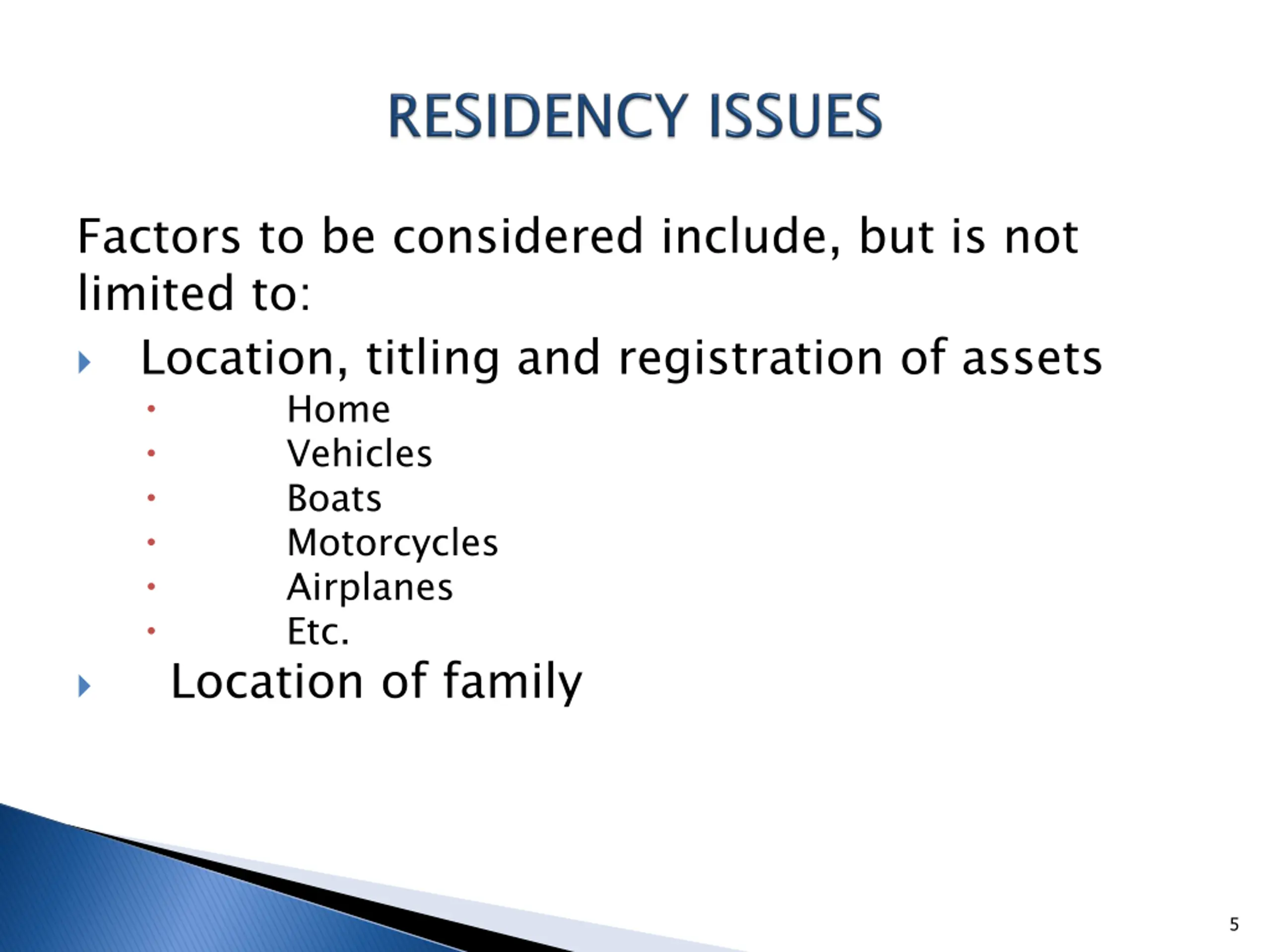 Factors to be considered include, but is not limited to: Location, titling and registration of assets Home Location of family Vehicles Boats Motorcycles Airplanes Etc. 5