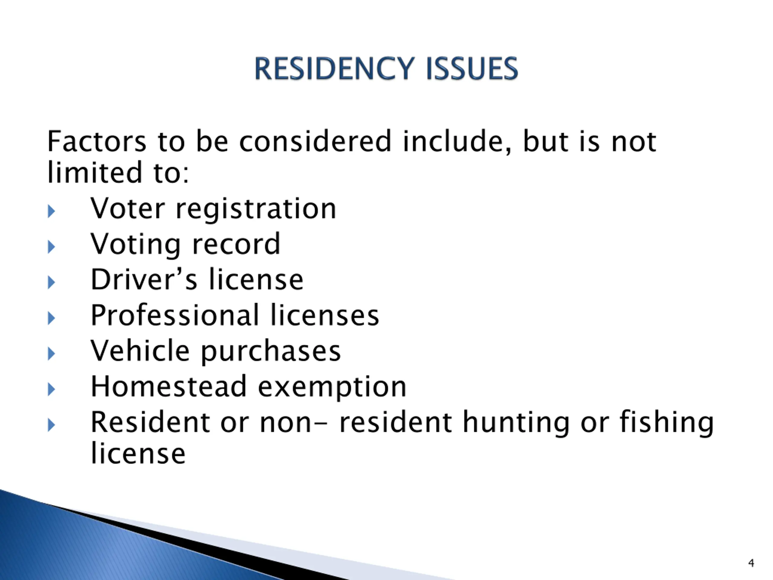 Factors to be considered include, but is not limited to: Voter registration Voting record Driver s license Professional licenses Vehicle purchases Homestead exemption Resident or non- resident hunting or fishing license 4