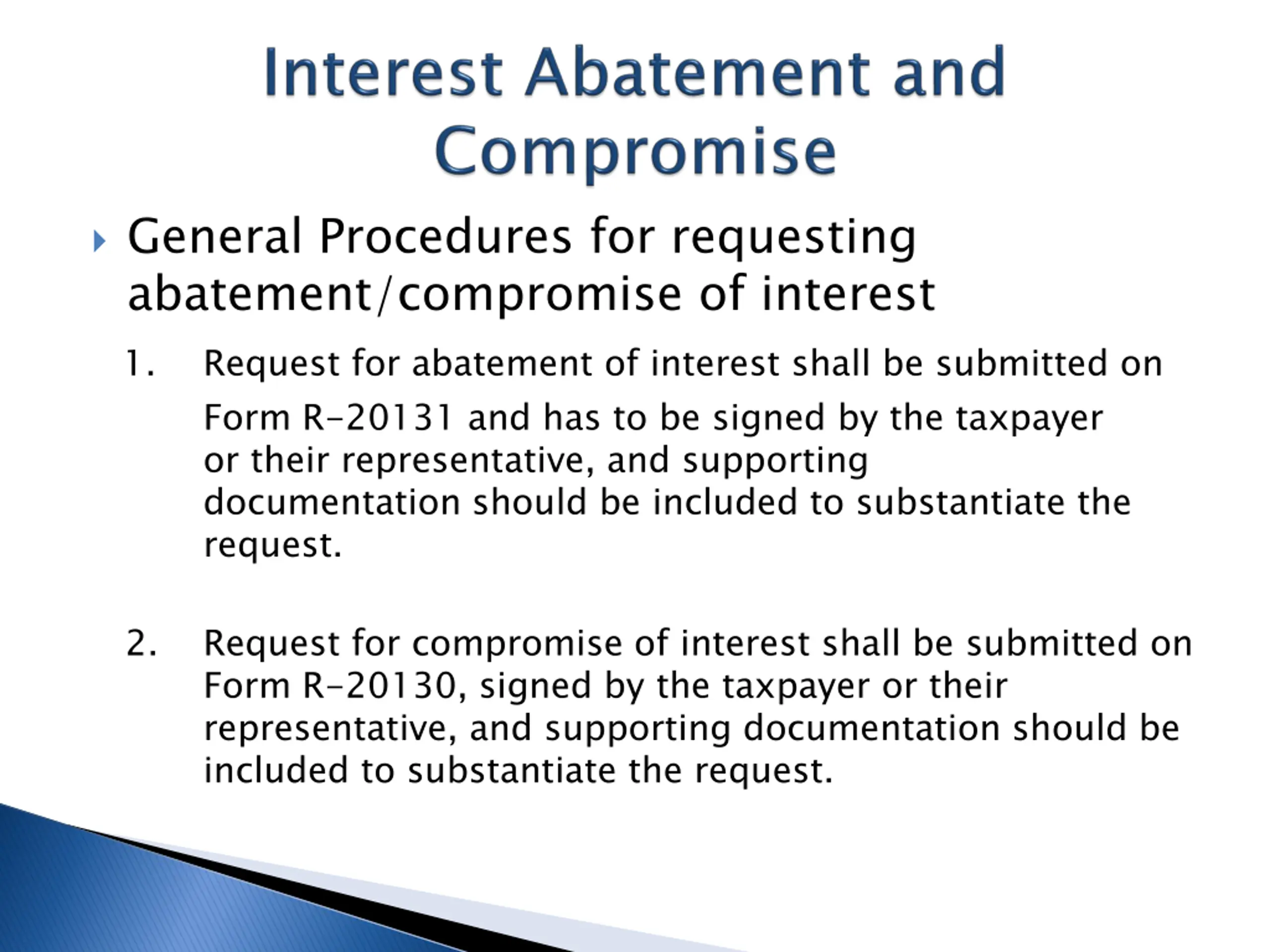 General Procedures for requesting abatement/compromise of interest 1. or their representative, and supporting documentation should be included to substantiate the request. Request for abatement of interest shall be submitted on Form R-20131 and has to be signed by the taxpayer 2. Request for compromise of interest shall be submitted on Form R-20130, signed by the taxpayer or their representative, and supporting documentation should be included to substantiate the request.