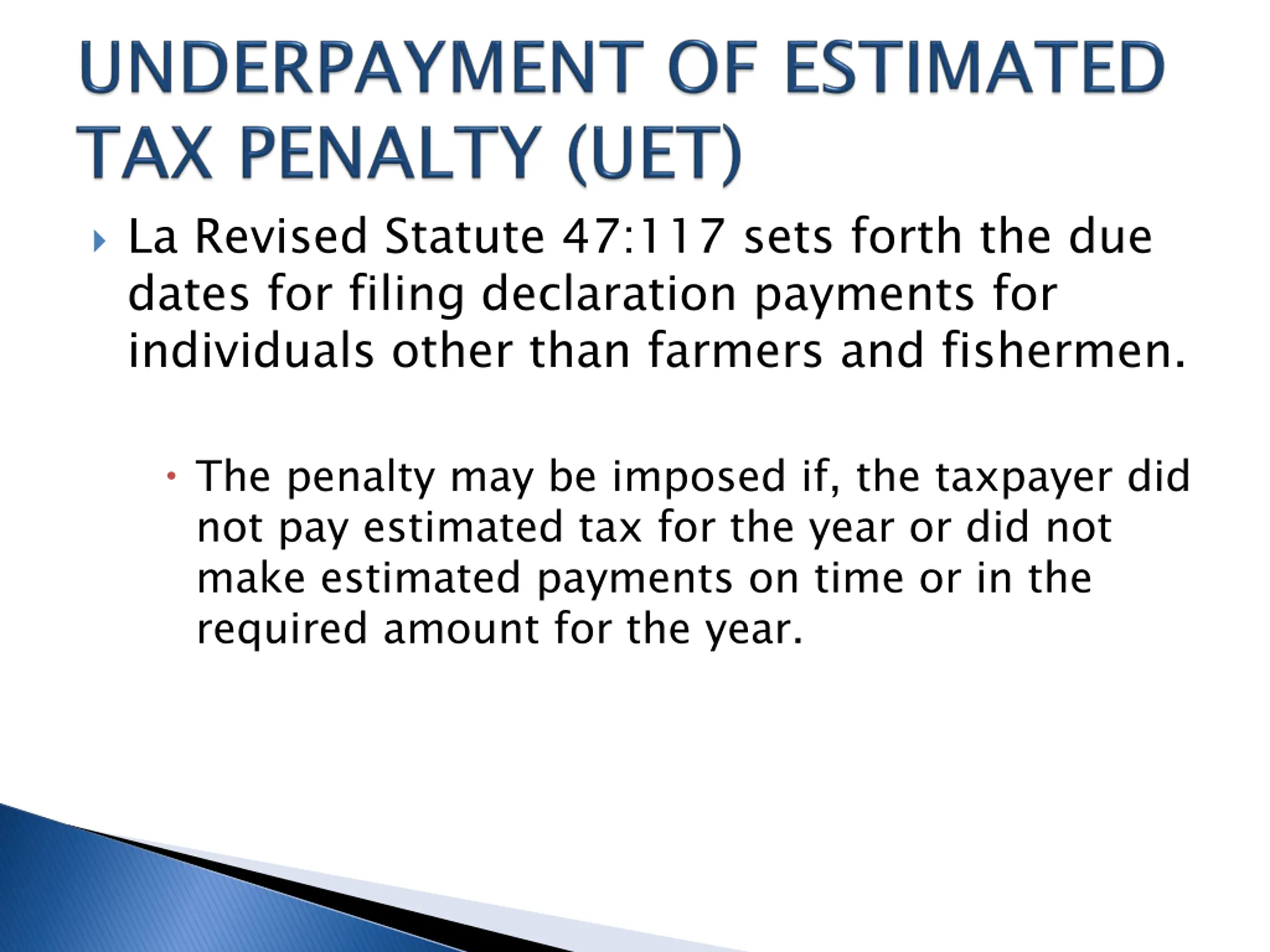 La Revised Statute 47:117 sets forth the due dates for filing declaration payments for individuals other than farmers and fishermen. The penalty may be imposed if, the taxpayer did not pay estimated tax for the year or did not make estimated payments on time or in the required amount for the year.