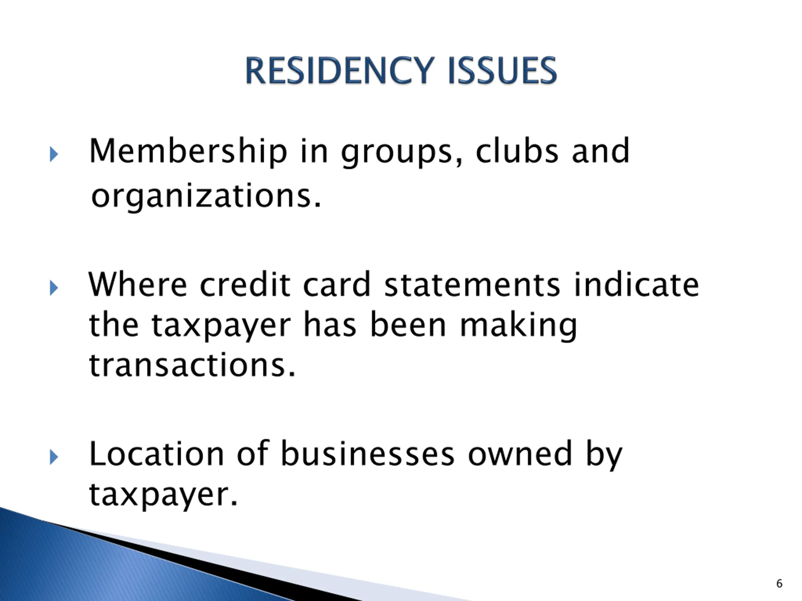Membership in groups, clubs and organizations. Where credit card statements indicate the taxpayer has been making transactions. Location of businesses owned by taxpayer. 6