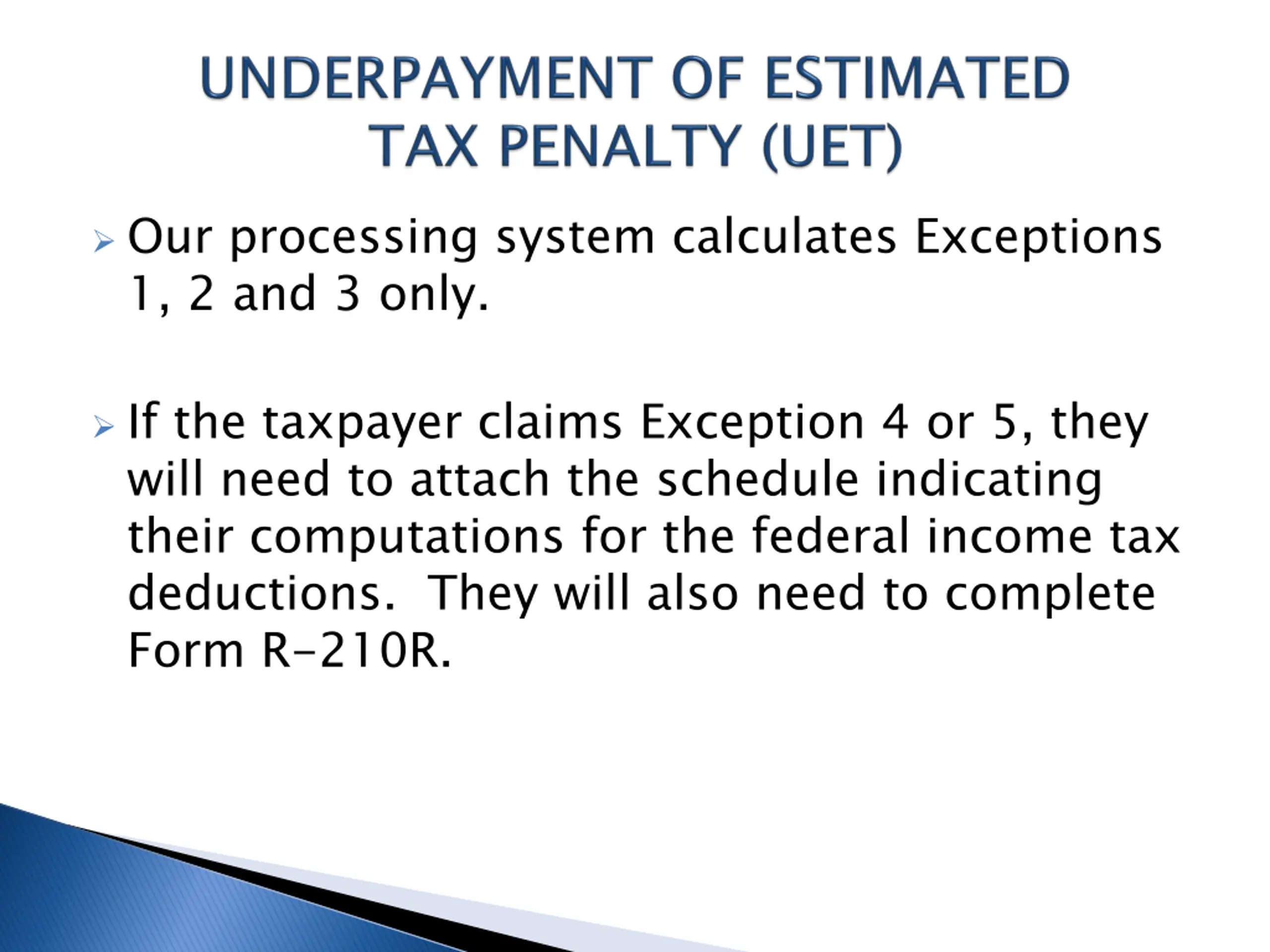Our processing system calculates Exceptions 1, 2 and 3 only. If the taxpayer claims Exception 4 or 5, they will need to attach the schedule indicating their computations for the federal income tax deductions. They will also need to complete Form R-210R.
