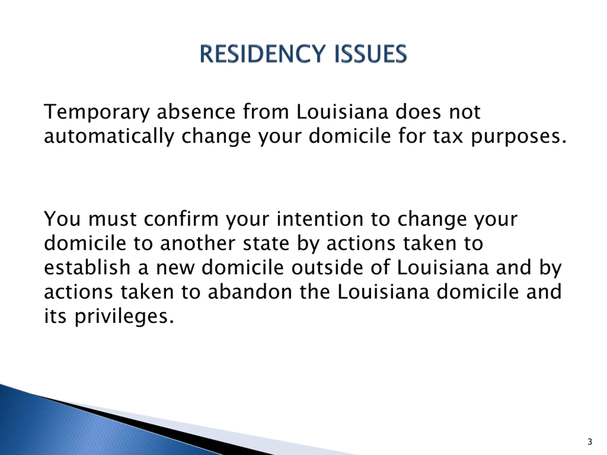 Temporary absence from Louisiana does not automatically change your domicile for tax purposes. You must confirm your intention to change your domicile to another state by actions taken to establish a new domicile outside of Louisiana and by actions taken to abandon the Louisiana domicile and its privileges. 3