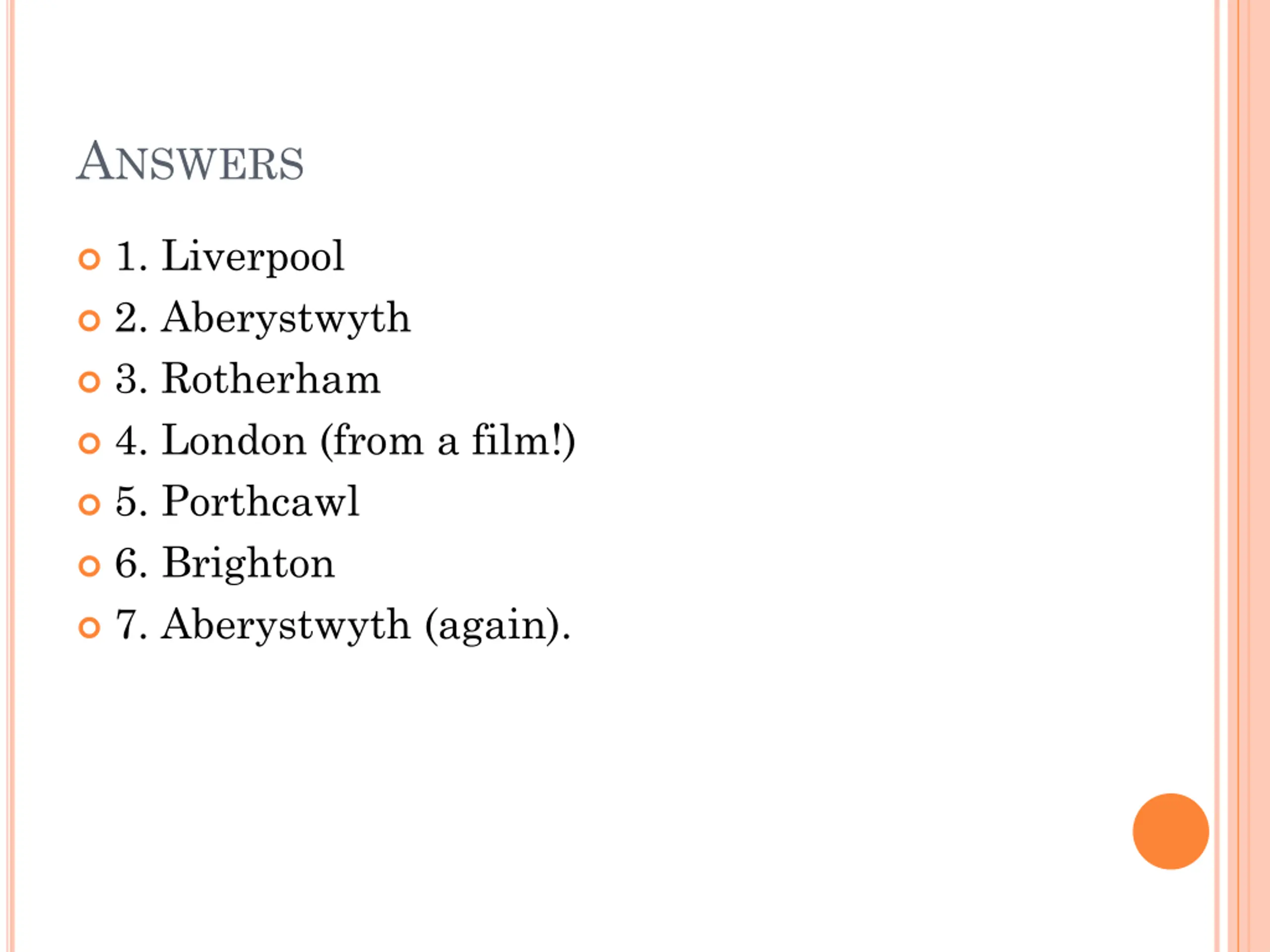 ANSWERS 1. Liverpool 2. Aberystwyth 3. Rotherham 4. London (from a film!) 5. Porthcawl 6. Brighton 7. Aberystwyth (again).